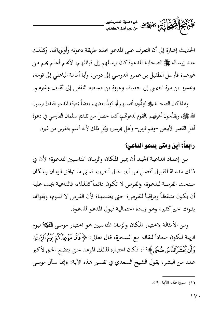 وبهذا كان الصحابة - رضي الله عنهم - يُعِدُّون أنفسهم أو يُعِدُّ بعضهم بعضاً بمعرفة المدعو اقتداءً برسول الله - صلى الله عليه وسلم -، ويقدِّمون أعرفهم بالقوم لدعوتهم، كما حصل من تقديم سلمان الفارسي في دعوة أهل القصر الأبيض -وهم فرس- وأهل بهرسير، وكل ذلك لأنه أعلم بالفرس من غيره.