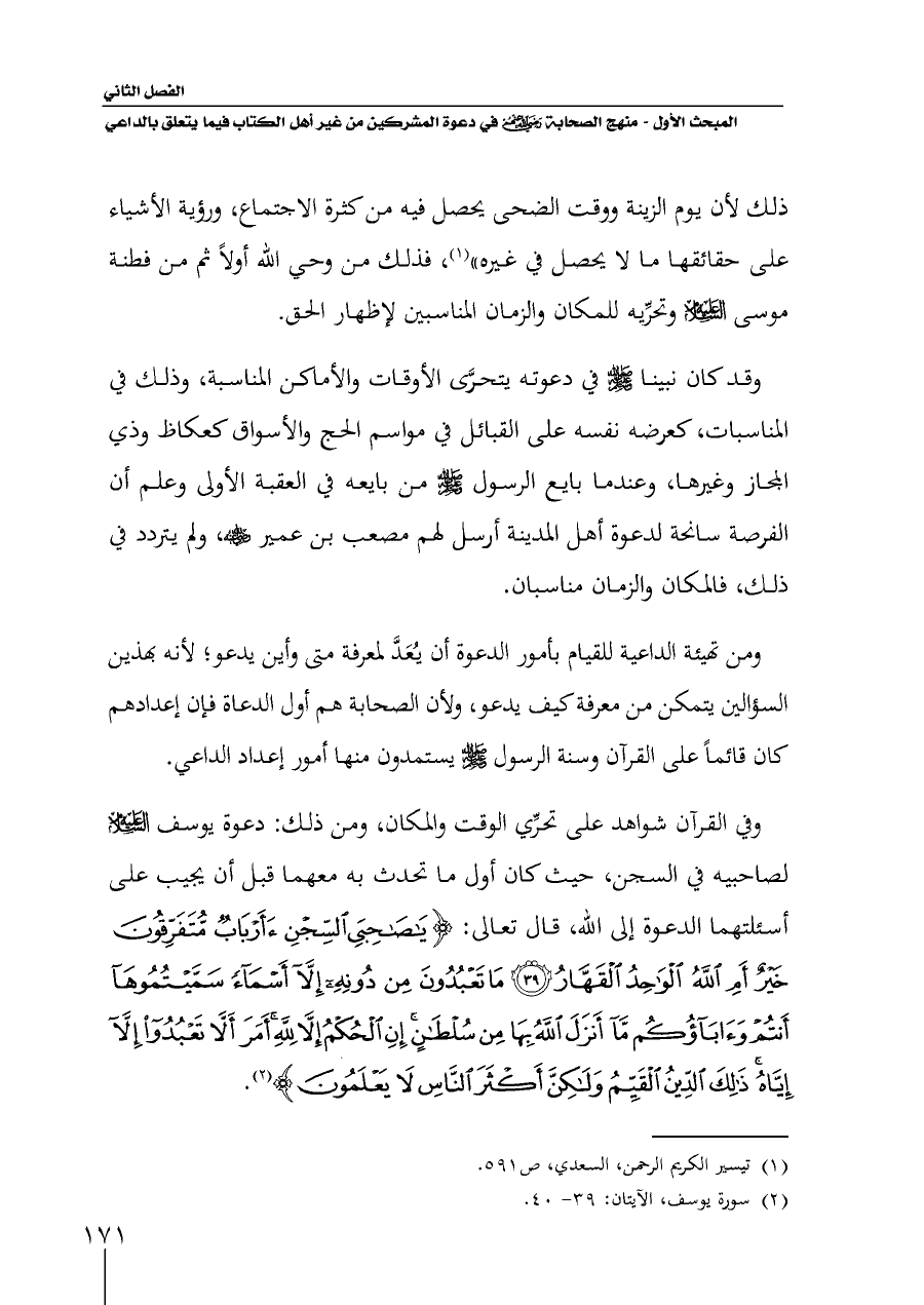 وفي القرآن شواهد على تحرِّي الوقت والمكان، ومن ذلك: دعوة يوسف - عليه السلام - لصاحبيه في السجن، حيث كان أول ما تحدث به معهما قبل أن يجيب على أسئلتهما الدعوة إلى الله، قال تعالى: {يَاصَاحِبَيِ السِّجْنِ أَأَرْبَابٌ مُتَفَرِّقُونَ خَيْرٌ أَمِ اللَّهُ الْوَاحِدُ الْقَهَّارُ (٣٩) مَا تَعْبُدُونَ مِنْ دُونِهِ إِلَّا أَسْمَاءً سَمَّيْتُمُوهَا أَنْتُمْ وَآبَاؤُكُمْ مَا أَنْزَلَ اللَّهُ بِهَا مِنْ سُلْطَانٍ إِنِ الْحُكْمُ إِلَّا لِلَّهِ أَمَرَ أَلَّا تَعْبُدُوا إِلَّا إِيَّاهُ ذَلِكَ الدِّينُ الْقَيِّمُ وَلَكِنَّ أَكْثَرَ النَّاسِ لَا يَعْلَمُونَ} (¬٢).
