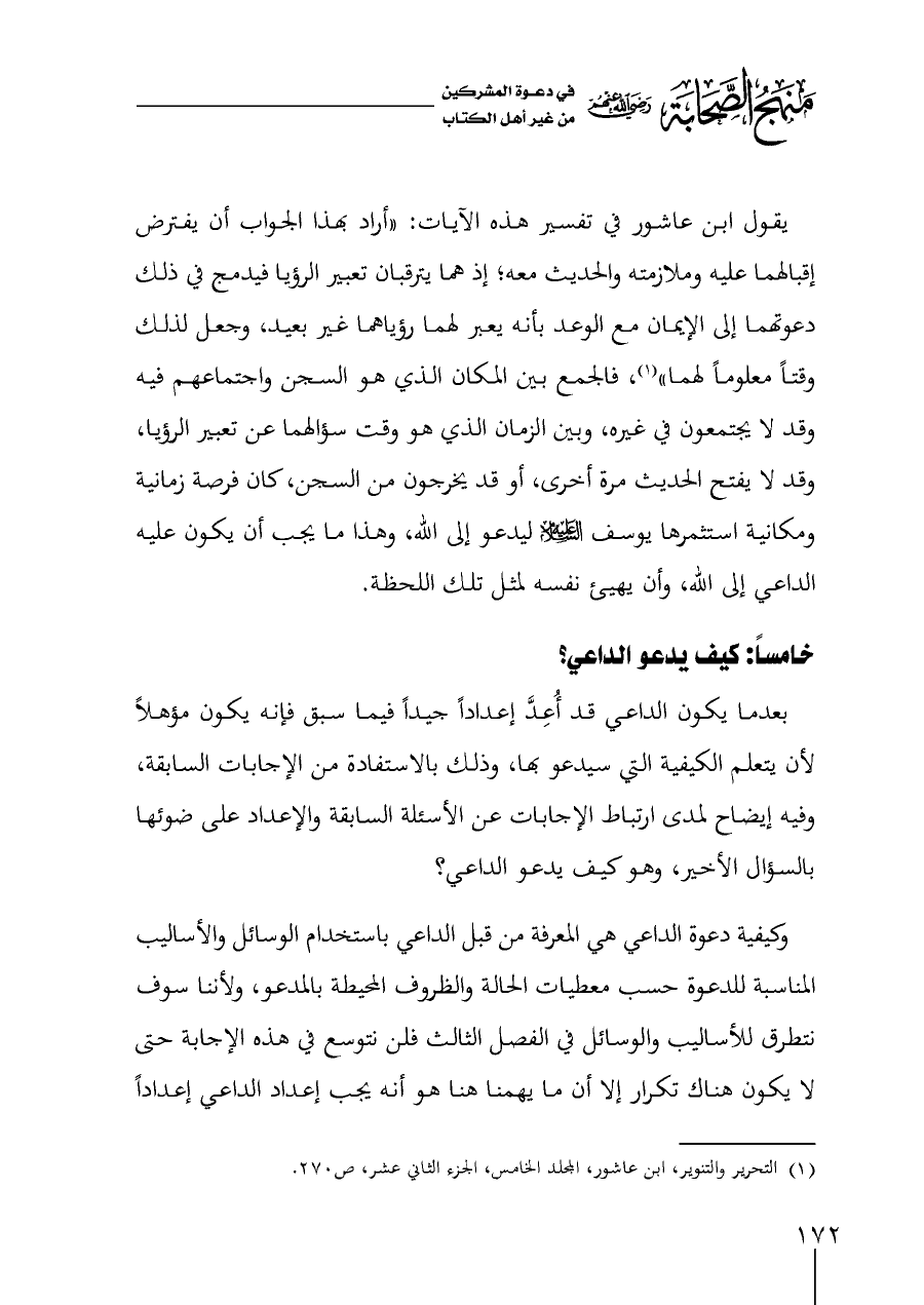 يقول ابن عاشور في تفسير هذه الآيات: (أراد بهذا الجواب أن يفترض إقبالهما عليه وملازمته والحديث معه؛ إذ هما يترقبان تعبير الرؤيا فيدمج في ذلك دعوتهما إلى الإيمان مع الوعد بأنه يعبر لهما رؤياهما غير بعيد، وجعل لذلك وقتاً معلوماً لهما" (¬١)، فالجمع بين المكان الذي هو السجن واجتماعهم فيه وقد لا يجتمعون في غيره، وبين الزمان الذي هو وقت سؤالهما عن تعبير الرؤيا، وقد لا يفتح الحديث مرة أخرى، أو قد يخرجون من السجن، كان فرصة زمانية ومكانية استثمرها يوسف - عليه السلام - ليدعو إلى الله، وهذا ما يجب أن يكون عليه الداعي إلى الله، وأن يهيئ نفسه لمثل تلك اللحظة.