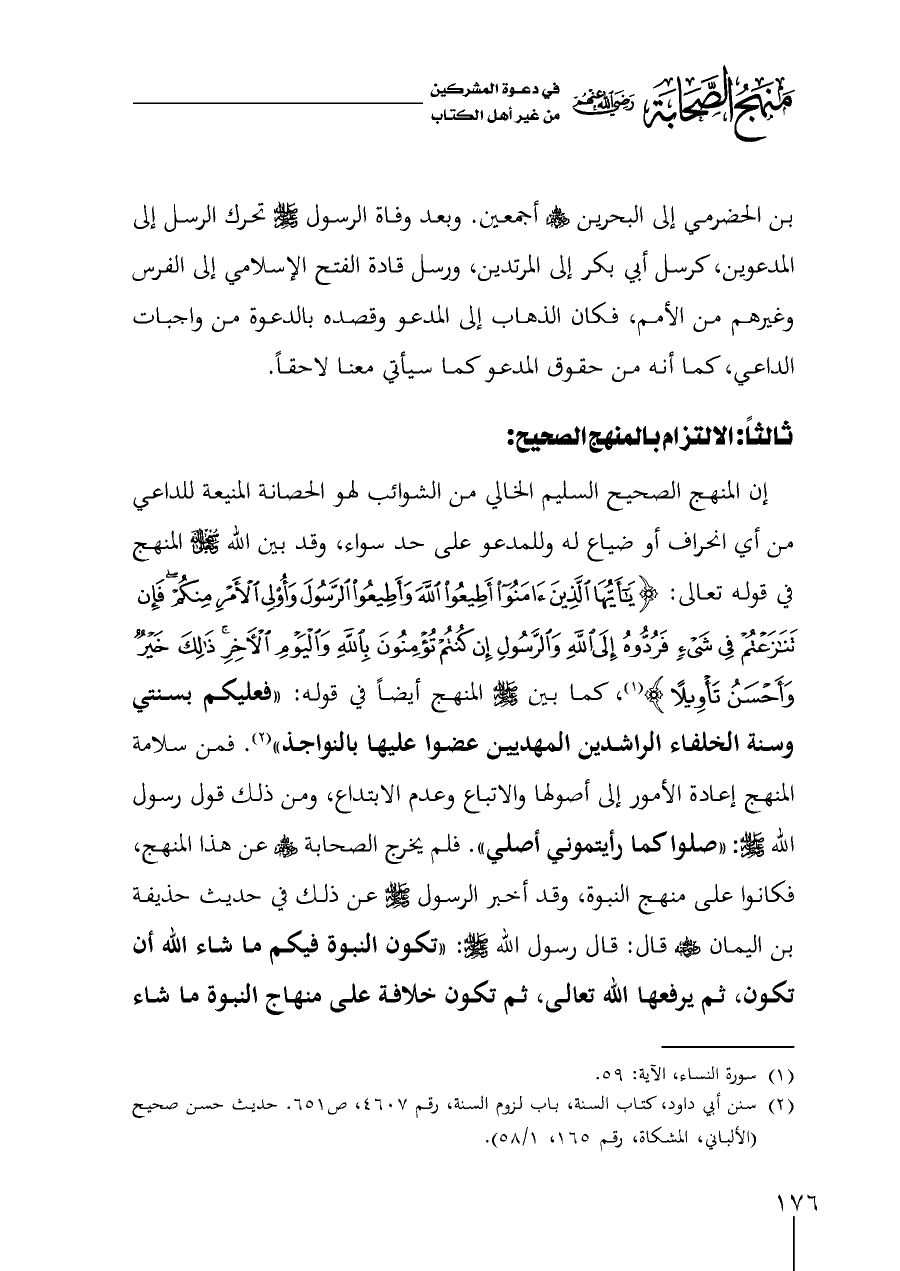 إن المنهج الصحيح السليم الخالي من الشوائب لهو الحصانة المنيعة للداعي من أي انحراف أو ضياع له وللمدعو على حد سواء، وقد بين الله - سبحانه وتعالى - المنهج في قوله تعالى: {يَاأَيُّهَا الَّذِينَ آمَنُوا أَطِيعُوا اللَّهَ وَأَطِيعُوا الرَّسُولَ وَأُولِي الْأَمْرِ مِنْكُمْ فَإِنْ تَنَازَعْتُمْ فِي شَيْءٍ فَرُدُّوهُ إِلَى اللَّهِ وَالرَّسُولِ إِنْ كُنْتُمْ تُؤْمِنُونَ بِاللَّهِ وَالْيَوْمِ الْآخِرِ ذَلِكَ خَيْرٌ وَأَحْسَنُ تَأْوِيلًا} (¬١)، كما بين - صلى الله عليه وسلم - المنهج أيضاً في قوله: (فعليكم بسنتي وسنة الخلفاء الراشدين المهديين عضوا عليها بالنواجذ ((¬٢). فمن سلامة المنهج إعادة الأمور إلى أصولها والاتباع وعدم الابتداع، ومن ذلك قول رسول الله - صلى الله عليه وسلم -: (صلوا كما رأيتموني أصلي (. فلم يخرج الصحابة - رضي الله عنهم - عن هذا المنهج، فكانوا على منهج النبوة، وقد أخبر الرسول - صلى الله عليه وسلم - عن ذلك في حديث حذيفة بن اليمان - رضي الله عنه - قال: قال رسول الله - صلى الله عليه وسلم -: (تكون النبوة فيكم ما شاء الله أن تكون، ثم يرفعها الله تعالى، ثم تكون خلافة على منهاج النبوة ما شاء