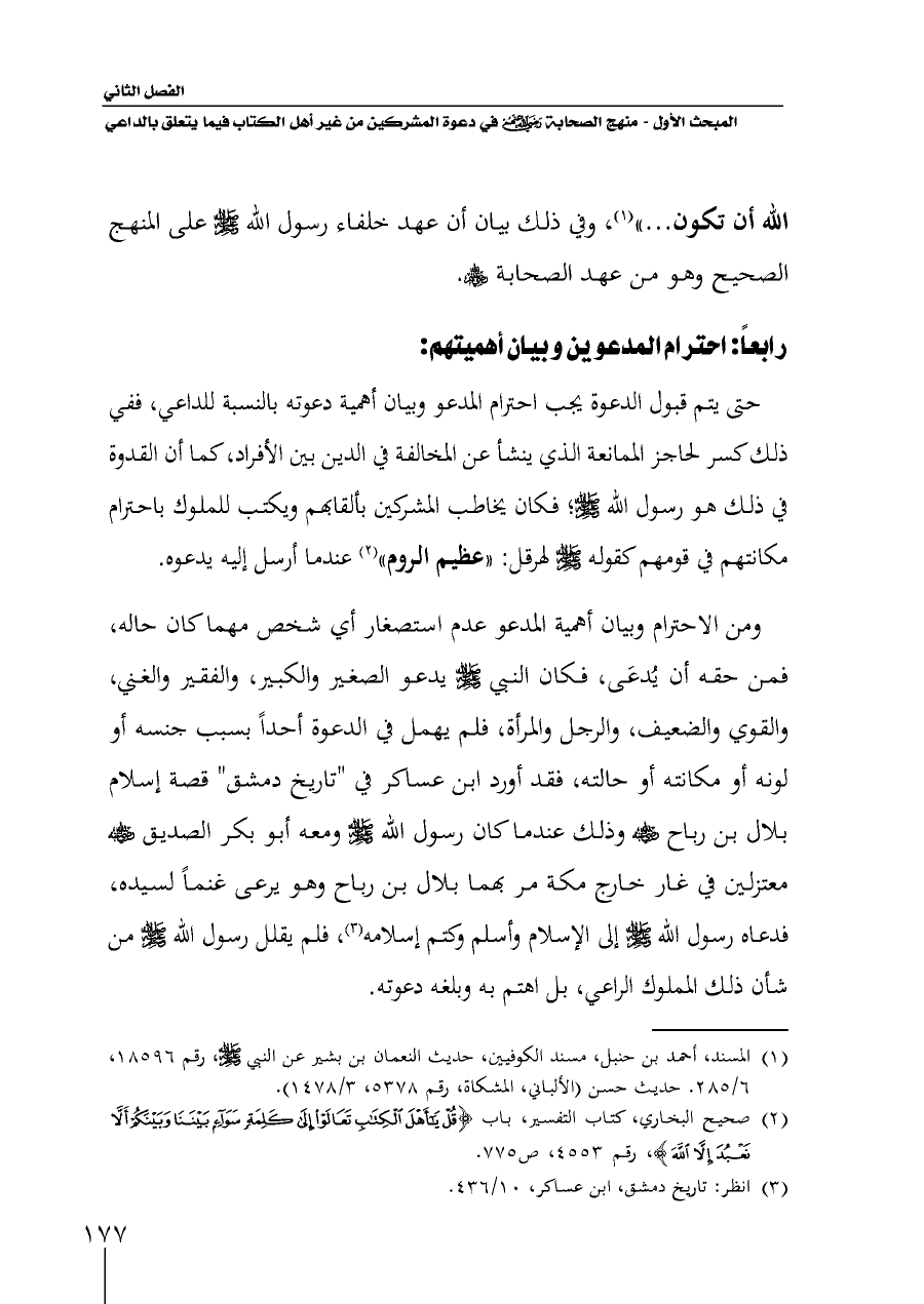 (¬٢) صحيح البخاري، كتاب التفسير، باب {قُلْ يَاأَهْلَ الْكِتَابِ تَعَالَوْا إِلَى كَلِمَةٍ سَوَاءٍ بَيْنَنَا وَبَيْنَكُمْ أَلَّا نَعْبُدَ إِلَّا اللَّهَ}، رقم ٤٥٥٣، ص ٧٧٥.