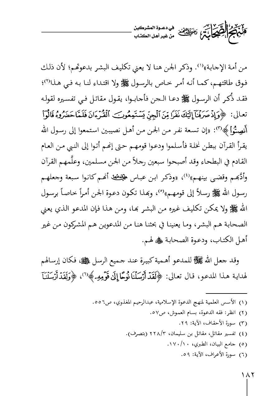 من أمة الإجابة" (¬١). وذكر الجن هنا لا يعني تكليف البشر بدعوتهم؛ لأن ذلك فوق طاقتهم، كما أنه أمر خاص بالرسول - صلى الله عليه وسلم - ولا اقتداء لنا به في هذا (¬٢)؛ فقد ذُكر أن الرسول - صلى الله عليه وسلم - دعا الجن فأجابوا، يقول مقاتل في تفسيره لقوله تعالى: {وَإِذْ صَرَفْنَا إِلَيْكَ نَفَرًا مِنَ الْجِنِّ يَسْتَمِعُونَ الْقُرْآنَ فَلَمَّا حَضَرُوهُ قَالُوا أَنْصِتُوا} (¬٣): "إن تسعة نفر من الجن من أهل نصيبين استمعوا إلى رسول الله يقرأ القرآن ببطن نخلة فأسلموا ودعوا قومهم حتى إنهم أتوا إلى النبي من العام القادم في البطحاء وقد أصبحوا سبعين رجلاً من الجن مسلمين، وعلَّمهم القرآن وأدَّبهم وقضى بينهم" (¬٤)، "وذكر ابن عباس - رضي الله عنهما - أنهم كانوا سبعة وجعلهم رسول الله - صلى الله عليه وسلم - رسلاً إلى قومهم" (¬٥)، وبهذا تكون دعوة الجن أمراً خاصاً برسول الله - صلى الله عليه وسلم - ولا يمكن تكليف غيره من البشر بها، ومن هذا فإن المدعو الذي يعني الصحابة هم البشر، وما يعنينا في بحثنا هنا من المدعوين هم المشركون من غير أهل الكتاب، ودعوة الصحابة - رضي الله عنهم - لهم.