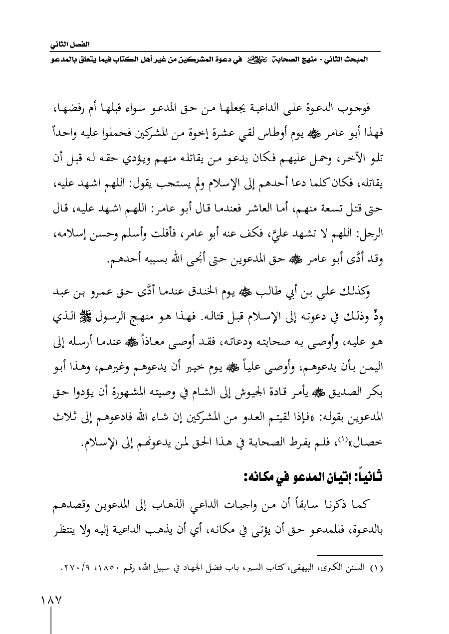 وكذلك علي بن أبي طالب - رضي الله عنه - يوم الخندق عندما أدَّى حق عمرو بن عبد وِدٍّ وذلك في دعوته إلى الإسلام قبل قتاله. فهذا هو منهج الرسول - صلى الله عليه وسلم - الذي هو عليه، وأوصى به صحابته ودعاته، فقد أوصى معاذاً - رضي الله عنه - عندما أرسله إلى اليمن بأن يدعوهم، وأوصى علياً - رضي الله عنه - يوم خيبر أن يدعوهم وغيرهم، وهذا أبو بكر الصديق - رضي الله عنه - يأمر قادة الجيوش إلى الشام في وصيته المشهورة أن يؤدوا حق المدعوين بقوله: "فإذا لقيتم العدو من المشركين إن شاء الله فادعوهم إلى ثلاث خصال" (¬١)، فلم يفرط الصحابة في هذا الحق لمن يدعونهم إلى الإسلام.