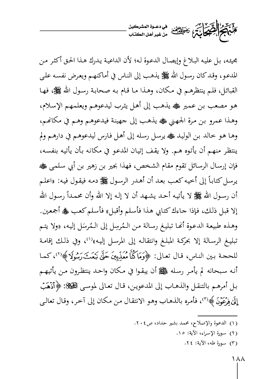 مجيئه، بل عليه البلاغ وإيصال الدعوة له؛ لأن الداعية يدرك هذا الحق أكثر من المدعو، وقد كان رسول الله - صلى الله عليه وسلم - يذهب إلى الناس في أماكنهم ويعرض نفسه على القبائل، فلم ينتظرهم في مكان، وهذا ما قام به صحابة رسول الله - صلى الله عليه وسلم -، فها هو مصعب بن عمير - رضي الله عنه - يذهب إلى أهل يثرب ليدعوهم ويعلمهم الإسلام، وهذا عمرو بن مرة الجهني - رضي الله عنه - يذهب إلى جهينة فيدعوهم وهم في مكانهم، وها هو خالد بن الوليد - رضي الله عنه - يرسل رسله إلى أهل فارس ليدعوهم في دارهم ولم ينتظر منهم أن يأتوه هم. ولا يقف إتيان المدعو في مكانه بأن يأتيه بنفسه، فإن إرسال الرسائل تقوم مقام الشخص، فهذا بجير بن زهير بن أبي سلمى - رضي الله عنه - يرسل كتاباً إلى أخيه كعب بعد أن أهدر الرسول - صلى الله عليه وسلم - دمه فيقول فيها: "اعلم أن رسول الله - صلى الله عليه وسلم - لا يأتيه أحد يشهد أن لا إله إلا الله وأن محمداً رسول الله إلا قبل ذلك، فإذا جاءك كتابي هذا فأسلم وأقبل" فأسلم كعب - رضي الله عنهم - أجمعين. وهذه طبيعة الدعوة أنها تبليغ رسالة من المُرسِل إلى المُرسَل إليه، "ولا يتم تبليغ الرسالة إلا بحركة المبلغ وانتقاله إلى المرسل إليه" (¬١)، وفي ذلك إقامة للحجة بين الناس، قال تعالى: {وَمَا كُنَّا مُعَذِّبِينَ حَتَّى نَبْعَثَ رَسُولًا} (¬٢)، كما أنه سبحانه لم يأمر رسله - عليهم السلام - أن يبقوا في مكان واحد ينتظرون من يأتيهم بل أمرهم بالتنقل والذهاب إلى المدعوين، قال تعالى لموسى - عليه السلام -: {اذْهَبْ إِلَى فِرْعَوْنَ} (¬٣)،