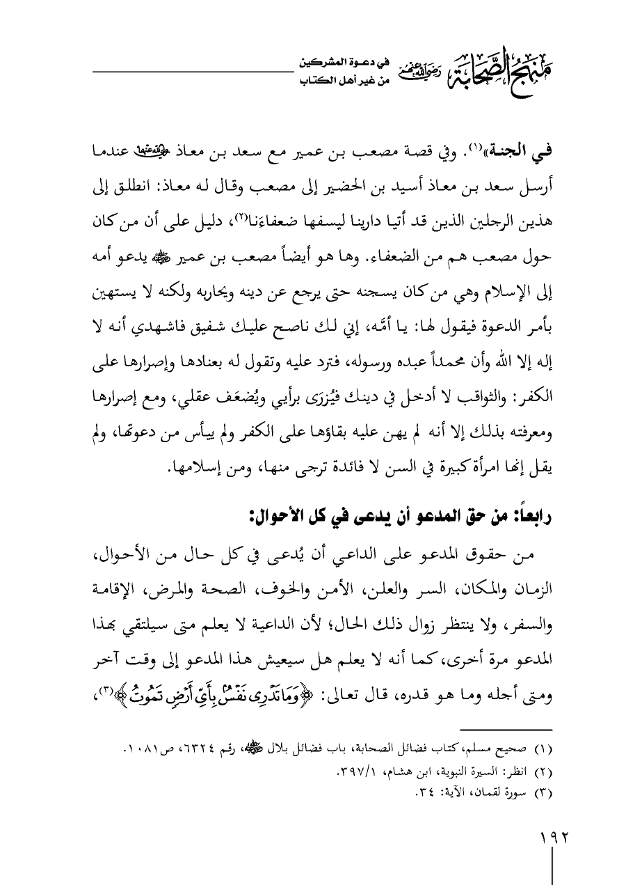 في الجنة ((¬١). وفي قصة مصعب بن عمير مع سعد بن معاذ - رضي الله عنهما - عندما أرسل سعد بن معاذ أسيد بن الحضير إلى مصعب فقال له معاذ: انطلق إلى هذين الرجلين الذين قد أتيا دارينا ليسفها ضعفاءَنا (¬٢)، دليل على أن من كان حول مصعب هم من الضعفاء. وها هو أيضاً مصعب بن عمير - رضي الله عنه - يدعو أمه إلى الإسلام وهي من كان يسجنه حتى يرجع عن دينه ويحاربه ولكنه لا يستهين بأمر الدعوة فيقول لها: يا أمَّه، إني لك ناصح عليك شفيق فاشهدي أنه لا إله إلا الله وأن محمداً عبده ورسوله، فترد عليه وتقول له بعنادها وإصرارها على الكفر: والثواقب لا أدخل في دينك فيُزرَى برأيي ويُضعَف عقلي، ومع إصرارها ومعرفته بذلك إلا أنه لم يهن عليه بقاؤها على الكفر ولم ييأس من دعوتها، ولم يقل إنها امرأة كبيرة في السن لا فائدة ترجى منها، ومن إسلامها.