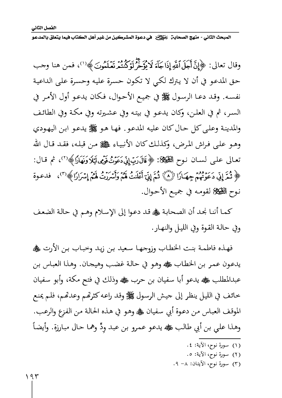 وقال تعالى: {إِنَّ أَجَلَ اللَّهِ إِذَا جَاءَ لَا يُؤَخَّرُ لَوْ كُنْتُمْ تَعْلَمُونَ} (¬١)، فمن هنا وجب حق المدعو في أن لا يترك لكي لا تكون حسرة عليه وحسرة على الداعية نفسه. وقد دعا الرسول - صلى الله عليه وسلم - في جميع الأحوال، فكان يدعو أول الأمر في السر، ثم في العلن، وكان يدعو في بيته وفي عشيرته وفي مكة وفي الطائف والمدينة وعلى كل حال كان عليه المدعو. فها هو - صلى الله عليه وسلم - يدعو ابن اليهودي وهو على فراش المرض، وكذلك كان الأنبياء - عليهم السلام - من قبله، فقد قال الله تعالى على لسان نوح - عليه السلام -: {قَالَ رَبِّ إِنِّي دَعَوْتُ قَوْمِي لَيْلًا وَنَهَارًا} (¬٢)، ثم قال: {ثُمَّ إِنِّي دَعَوْتُهُمْ جِهَارًا (٨) ثُمَّ إِنِّي أَعْلَنْتُ لَهُمْ وَأَسْرَرْتُ لَهُمْ إِسْرَارًا} (¬٣)، فدعوة نوح - عليه السلام - لقومه في جميع الأحوال.