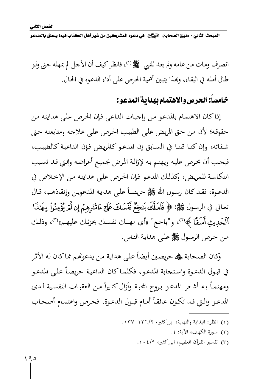 إذا كان الاهتمام بالمدعو من واجبات الداعي فإن الحرص على هدايته من حقوقه؛ لأن من حق المريض على الطبيب الحرص على علاجه ومتابعته حتى شفائه، وإن كنا قلنا في السابق إن المدعو كالمريض فإن الداعية كالطبيب، فيجب أن يحرص عليه ويهتم به لإزالة المرض بجميع أعراضه والتي قد تسبب انتكاسة للمريض، وكذلك المدعو فإن الحرص على هدايته من الإخلاص في الدعوة، فقد كان رسول الله - صلى الله عليه وسلم - حريصاً على هداية المدعوين وإنقاذهم، قال تعالى في الرسول - صلى الله عليه وسلم -: {فَلَعَلَّكَ بَاخِعٌ نَفْسَكَ عَلَى آثَارِهِمْ إِنْ لَمْ يُؤْمِنُوا بِهَذَا الْحَدِيثِ أَسَفًا} (¬٢)، و"باخع" "أي مهلك نفسك بحزنك عليهم" (¬٣)، وذلك من حرص الرسول - صلى الله عليه وسلم - على هداية الناس.