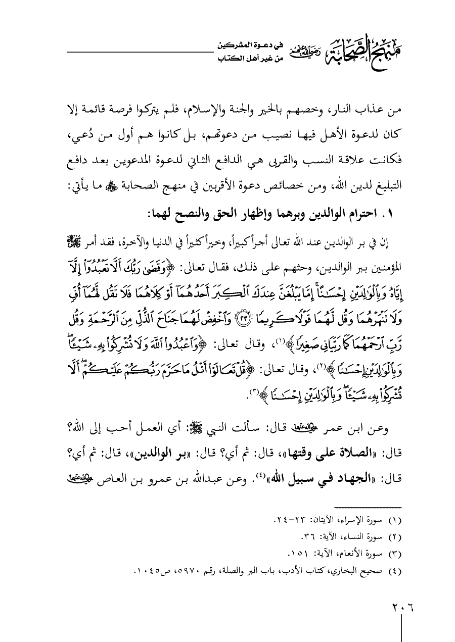 من عذاب النار، وخصهم بالخير والجنة والإسلام، فلم يتركوا فرصة قائمة إلا كان لدعوة الأهل فيها نصيب من دعوتهم، بل كانوا هم أول من دُعي، فكانت علاقة النسب والقربى هي الدافع الثاني لدعوة المدعوين بعد دافع التبليغ لدين الله، ومن خصائص دعوة الأقربين في منهج الصحابة - رضي الله عنهم - ما يأتي: