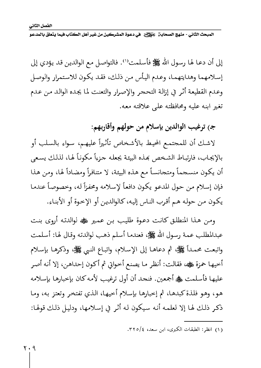 ومن هذا المنطلق كانت دعوة طليب بن عمير - رضي الله عنه - لوالدته أروى بنت عبدالمطلب عمة رسول الله - صلى الله عليه وسلم -، فعندما أسلم ذهب لوالدته وقال لها: أسلمت واتبعت محمداً - صلى الله عليه وسلم -، ثم دعاها إلى الإسلام، واتباع النبي - صلى الله عليه وسلم -، وذكرها بإسلام أخيها حمزة - رضي الله عنه -، فقالت: أنظر ما يصنع أخواتي ثم أكون إحداهن، إلا أنه أصر عليها فأسلمت - رضي الله عنهم - أجمعين. فنجد أن أول ترغيب لأمه كان بإخبارها بإسلامه هو، وهو فلذة كبدها، ثم إخبارها بإسلام أخيها، الذي تفتخر وتعتز به، وما ذكر ذلك لها إلا لعلمه أنه سيكون له أثر في إسلامها، ودليل ذلك قولها: