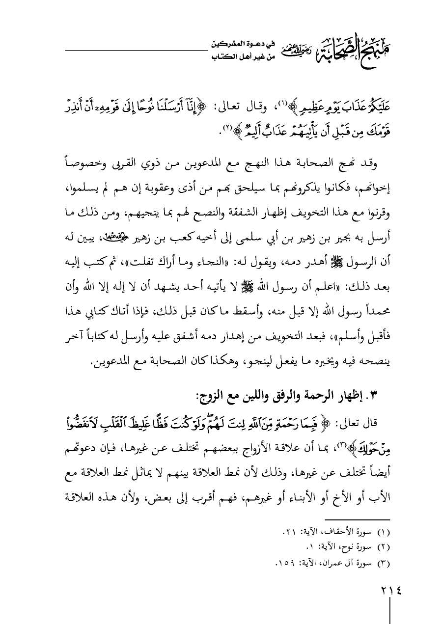 وقد نهج الصحابة هذا النهج مع المدعوين من ذوي القربى وخصوصاً إخوانهم، فكانوا يذكرونهم بما سيلحق بهم من أذى وعقوبة إن هم لم يسلموا، وقرنوا مع هذا التخويف إظهار الشفقة والنصح لهم بما ينجيهم، ومن ذلك ما أرسل به بجير بن زهير بن أبي سلمى إلى أخيه كعب بن زهير - رضي الله عنهما -، يبين له أن الرسول - صلى الله عليه وسلم - أهدر دمه، ويقول له: "النجاء وما أراك تفلت"، ثم كتب إليه بعد ذلك: "اعلم أن رسول الله - صلى الله عليه وسلم - لا يأتيه أحد يشهد أن لا إله إلا الله وأن محمداً رسول الله إلا قبل منه، وأسقط ما كان قبل ذلك، فإذا أتاك كتابي هذا فأقبل وأسلم"، فبعد التخويف من إهدار دمه أشفق عليه وأرسل له كتاباً آخر ينصحه فيه ويخبره ما يفعل لينجو، وهكذا كان الصحابة مع المدعوين.
