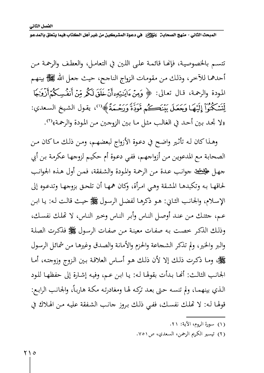وهذا كان له تأثير واضح في دعوة الأزواج لبعضهم، ومن ذلك ما كان من الصحابة مع المدعوين من أزواجهم، ففي دعوة أم حكيم لزوجها عكرمة بن أبي جهل - رضي الله عنهما - جوانب عدة من الرحمة والمودة والشفقة، فمن أول هذه الجوانب لحاقها به وتكبدها المشقة وهي امرأة، وكان همها أن تلحق بزوجها وتدعوه إلى الإسلام، والجانب الثاني: هو ذكرها لفضل الرسول - صلى الله عليه وسلم - حيث قالت له: يا ابن عم، جئتك من عند أوصل الناس وأبر الناس وخير الناس، لا تهلك نفسك، وذلك الذكر خصت به صفات معينة من صفات الرسول - صلى الله عليه وسلم - فذكرت الصلة والبر والخير، ولم تذكر الشجاعة والحزم والأمانة والصدق وغيرها من شمائل الرسول - صلى الله عليه وسلم -، وما ذكرت ذلك إلا لأن ذلك هو أساس العلاقة بين الزوج وزوجته، أما الجانب الثالث: أنها بدأت بقولها له: يا ابن عم، وفيه إشارة إلى حفظها للود الذي بينهما، ولم تنسه حتى بعد تركه لها ومغادرته مكة هارباً، والجانب الرابع: قولها له: لا تهلك نفسك، ففي ذلك بروز جانب الشفقة عليه من الهلاك في