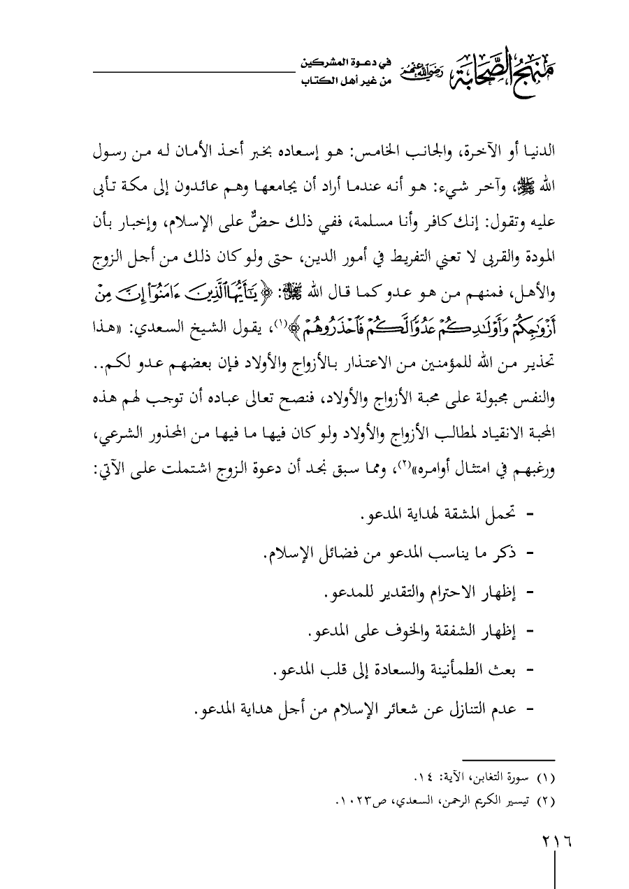 الدنيا أو الآخرة، والجانب الخامس: هو إسعاده بخبر أخذ الأمان له من رسول الله - صلى الله عليه وسلم -، وآخر شيء: هو أنه عندما أراد أن يجامعها وهم عائدون إلى مكة تأبى عليه وتقول: إنك كافر وأنا مسلمة، ففي ذلك حضٌّ على الإسلام، وإخبار بأن المودة والقربى لا تعني التفريط في أمور الدين، حتى ولو كان ذلك من أجل الزوج والأهل، فمنهم من هو عدو كما قال الله - سبحانه وتعالى -: {يَاأَيُّهَا الَّذِينَ آمَنُوا إِنَّ مِنْ أَزْوَاجِكُمْ وَأَوْلَادِكُمْ عَدُوًّا لَكُمْ فَاحْذَرُوهُمْ} (¬١)، يقول الشيخ السعدي: "هذا تحذير من الله للمؤمنين من الاعتذار بالأزواج والأولاد فإن بعضهم عدو لكم ..