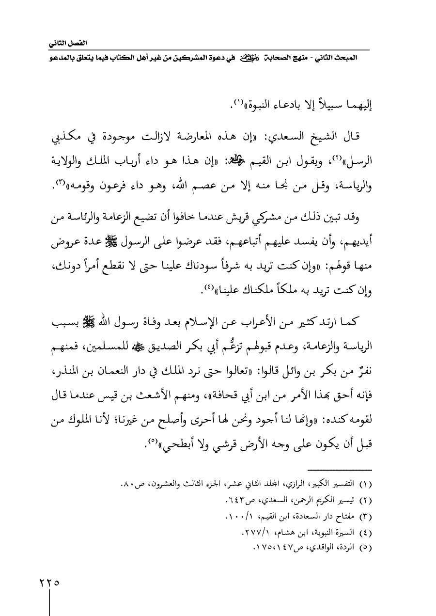 وقد تبين ذلك من مشركي قريش عندما خافوا أن تضيع الزعامة والرئاسة من أيديهم، وأن يفسد عليهم أتباعهم، فقد عرضوا على الرسول - صلى الله عليه وسلم - عدة عروض منها قولهم: "وإن كنت تريد به شرفاً سودناك علينا حتى لا نقطع أمراً دونك، وإن كنت تريد به ملكاً ملكناك علينا" (¬٤).
