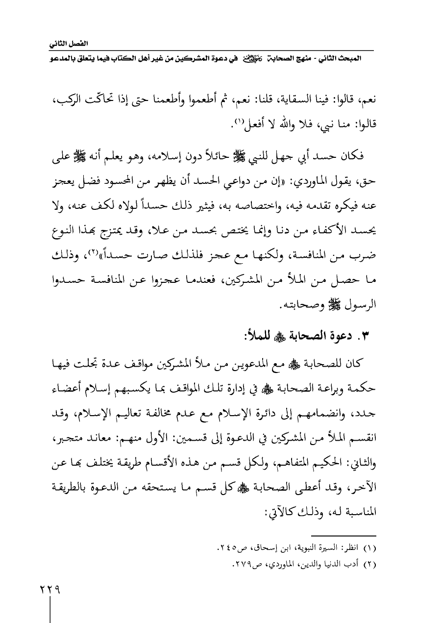 فكان حسد أبي جهل للنبي - صلى الله عليه وسلم - حائلاً دون إسلامه، وهو يعلم أنه - صلى الله عليه وسلم - على حق، يقول الماوردي: "إن من دواعي الحسد أن يظهر من المحسود فضل يعجز عنه فيكره تقدمه فيه، واختصاصه به، فيثير ذلك حسداً لولاه لكف عنه، ولا يحسد الأكفاء من دنا وإنما يختص بحسد من علا، وقد يمتزج بهذا النوع ضرب من المنافسة، ولكنها مع عجز فلذلك صارت حسداً" (¬٢)، وذلك ما حصل من الملأ من المشركين، فعندما عجزوا عن المنافسة حسدوا الرسول - صلى الله عليه وسلم - وصحابته.