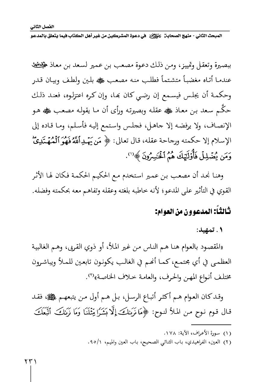 ببصيرة وتعقل وتمييز، ومن ذلك دعوة مصعب بن عمير لسعد بن معاذ - رضي الله عنهما - عندما أتاه مغضباً متشتماً فطلب منه مصعب - رضي الله عنه - بلين ولطف وبيان قدر وحكمة أن يجلس فيسمع إن رضي كان بها، وإن كره اعتزلوه، فعند ذلك حكَّم سعد بن معاذ - رضي الله عنه - عقله وبصيرته ورأى أن ما يقوله مصعب - رضي الله عنه - هو الإنصاف، ولا يرفضه إلا جاهل، فجلس واستمع إليه فأسلم، وما قاده إلى الإسلام إلا حكمته ورجاحة عقله، قال تعالى: {مَنْ يَهْدِ اللَّهُ فَهُوَ الْمُهْتَدِي وَمَنْ يُضْلِلْ فَأُولَئِكَ هُمُ الْخَاسِرُونَ} (¬١).