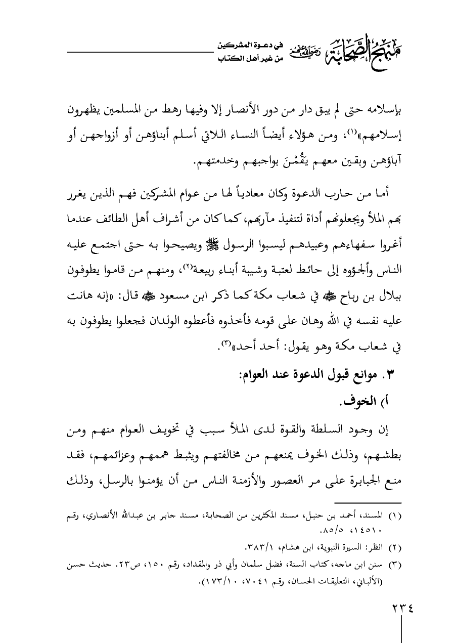 أما من حارب الدعوة وكان معادياً لها من عوام المشركين فهم الذين يغرر بهم الملأ ويجعلونهم أداة لتنفيذ مآربهم، كما كان من أشراف أهل الطائف عندما أغروا سفهاءهم وعبيدهم ليسبوا الرسول - صلى الله عليه وسلم - ويصيحوا به حتى اجتمع عليه الناس وألجؤوه إلى حائط لعتبة وشيبة أبناء ربيعة (¬٢)، ومنهم من قاموا يطوفون ببلال بن رباح - رضي الله عنه - في شعاب مكة كما ذكر ابن مسعود - رضي الله عنه - قال: "إنه هانت عليه نفسه في الله وهان على قومه فأخذوه فأعطوه الولدان فجعلوا يطوفون به في شعاب مكة وهو يقول: أحد أحد" (¬٣).