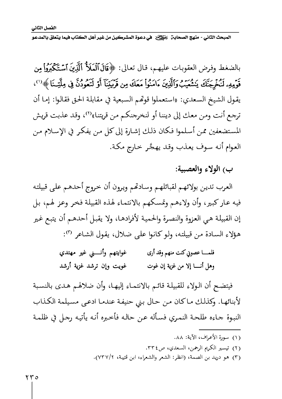 بالضغط وفرض العقوبات عليهم، قال تعالى: {قَالَ الْمَلَأُ الَّذِينَ اسْتَكْبَرُوا مِنْ قَوْمِهِ لَنُخْرِجَنَّكَ يَاشُعَيْبُ وَالَّذِينَ آمَنُوا مَعَكَ مِنْ قَرْيَتِنَا أَوْ لَتَعُودُنَّ فِي مِلَّتِنَا} (¬١)، يقول الشيخ السعدي: "استعملوا قوتهم السبعية في مقابلة الحق فقالوا: إما أن ترجع أنت ومن معك إلى ديننا أو لنخرجنكم من قريتنا" (¬٢)، وقد عذبت قريش المستضعفين ممن أسلموا فكان ذلك إشارة إلى كل من يفكر في الإسلام من العوام أنه سوف يعذب وقد يهجَّر خارج مكة.