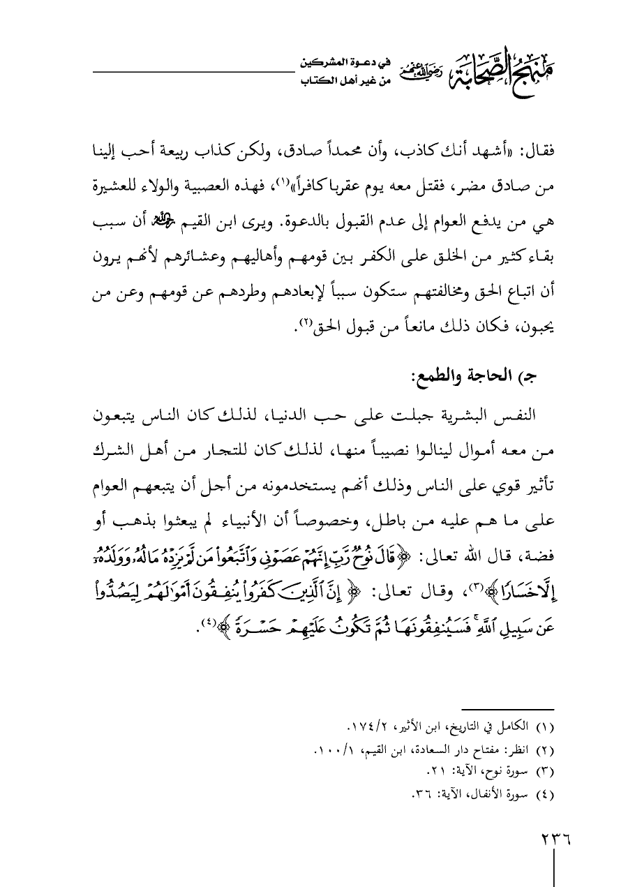 فقال: "أشهد أنك كاذب، وأن محمداً صادق، ولكن كذاب ربيعة أحب إلينا من صادق مضر، فقتل معه يوم عقربا كافراً" (¬١)، فهذه العصبية والولاء للعشيرة هي من يدفع العوام إلى عدم القبول بالدعوة. ويرى ابن القيم - رحمه الله - أن سبب بقاء كثير من الخلق على الكفر بين قومهم وأهاليهم وعشائرهم لأنهم يرون أن اتباع الحق ومخالفتهم ستكون سبباً لإبعادهم وطردهم عن قومهم وعن من يحبون، فكان ذلك مانعاً من قبول الحق (¬٢).
