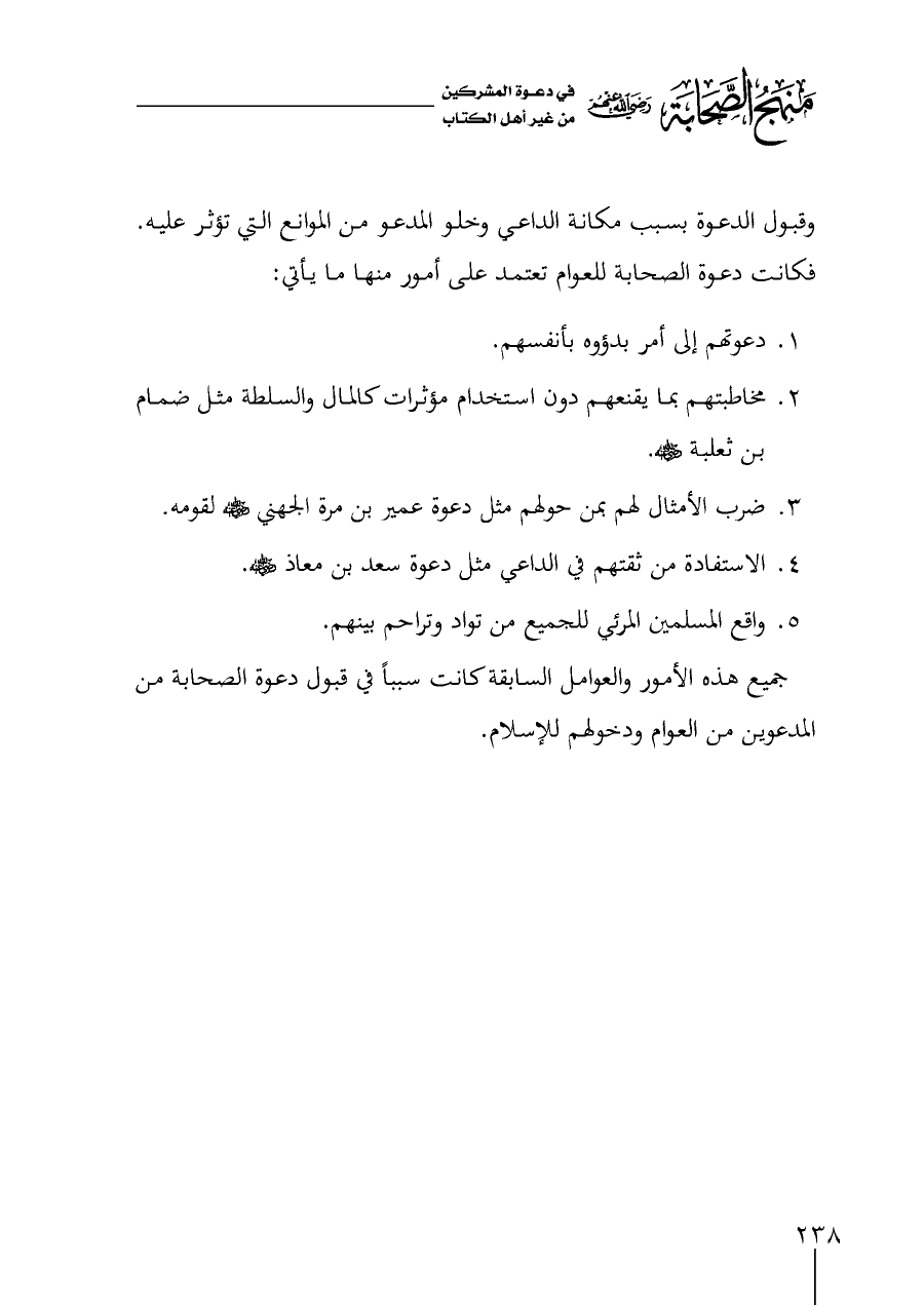٢ - مخاطبتهم بما يقنعهم دون استخدام مؤثرات كالمال والسلطة مثل ضمام بن ثعلبة - رضي الله عنه -.