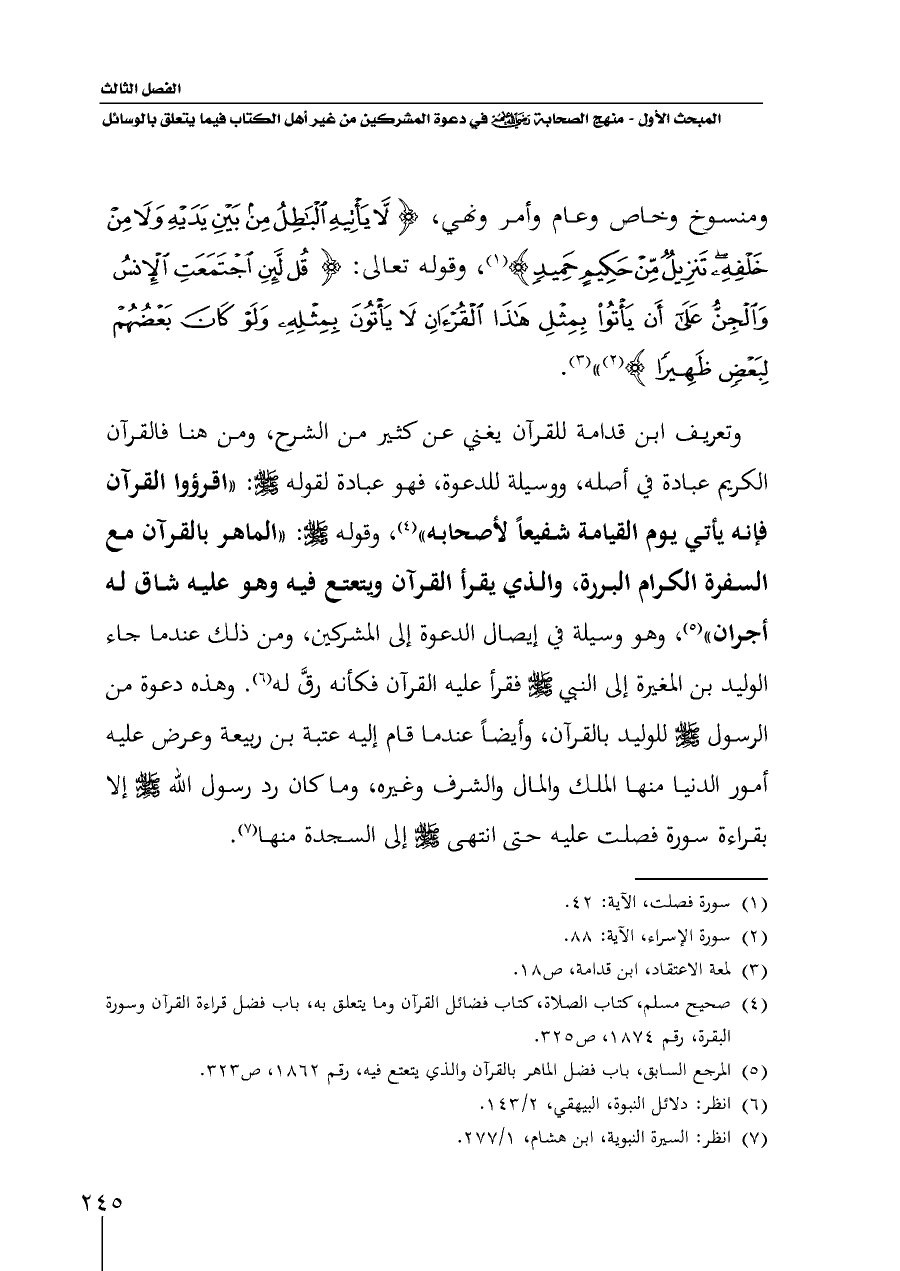 وتعريف ابن قدامة للقرآن يغني عن كثير من الشرح، ومن هنا فالقرآن الكريم عبادة في أصله، ووسيلة للدعوة، فهو عبادة لقوله - صلى الله عليه وسلم -: "اقرؤوا القرآن فإنه يأتي يوم القيامة شفيعاً لأصحابه" (¬٤)، وقوله - صلى الله عليه وسلم -: "الماهر بالقرآن مع السفرة الكرام البررة، والذي يقرأ القرآن ويتعتع فيه وهو عليه شاق له أجران" (¬٥)، وهو وسيلة في إيصال الدعوة إلى المشركين، ومن ذلك عندما جاء الوليد بن المغيرة إلى النبي - صلى الله عليه وسلم - فقرأ عليه القرآن فكأنه رقَّ له (¬٦). وهذه دعوة من الرسول - صلى الله عليه وسلم - للوليد بالقرآن، وأيضاً عندما قام إليه عتبة بن ربيعة وعرض عليه أمور الدنيا منها الملك والمال والشرف وغيره، وما كان رد رسول الله - صلى الله عليه وسلم - إلا بقراءة سورة فصلت عليه حتى انتهى - صلى الله عليه وسلم - إلى السجدة منها (¬٧).