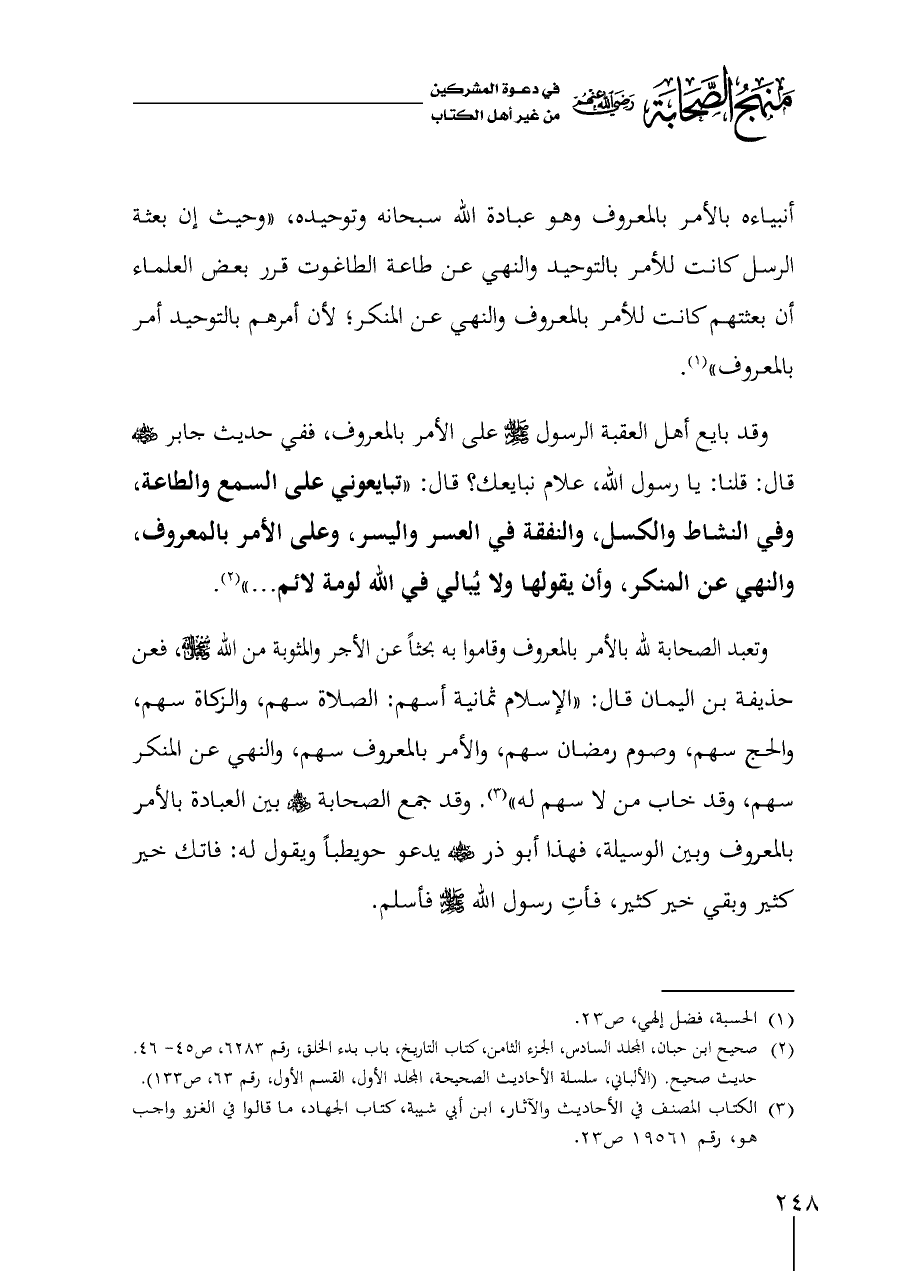 وتعبد الصحابة لله بالأمر بالمعروف وقاموا به بحثاً عن الأجر والمثوبة من الله - سبحانه وتعالى -، فعن حذيفة بن اليمان قال: "الإسلام ثمانية أسهم: الصلاة سهم، والزكاة سهم، والحج سهم، وصوم رمضان سهم، والأمر بالمعروف سهم، والنهي عن المنكر سهم، وقد خاب من لا سهم له" (¬٣). وقد جمع الصحابة - رضي الله عنهم - بين العبادة بالأمر بالمعروف وبين الوسيلة، فهذا أبو ذر - رضي الله عنه - يدعو حويطباً ويقول له: فاتك خير كثير وبقي خير كثير، فأتِ رسول الله - صلى الله عليه وسلم - فأسلم.