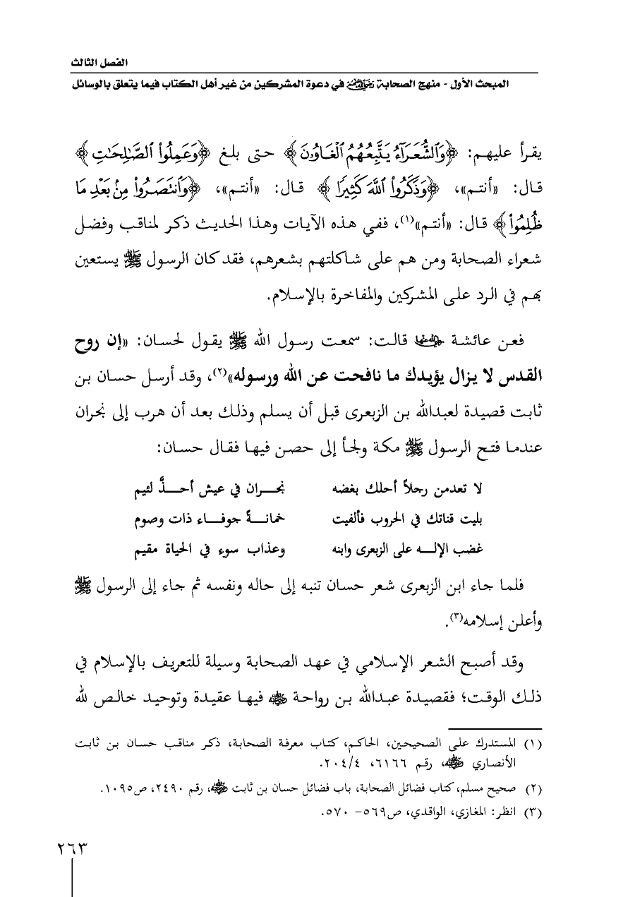 (¬٢) صحيح مسلم، كتاب فضائل الصحابة، باب فضائل حسان بن ثابت - رضي الله عنه -، رقم ٢٤٩٠، ص ١٠٩٥.