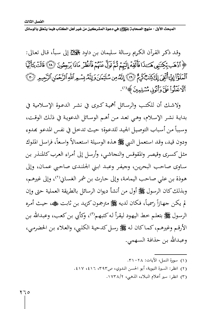 وقد ذكر القرآن الكريم رسالة سليمان بن داود - رضي الله عنه - إلى سبأ، قال تعالى: {اذْهَبْ بِكِتَابِي هَذَا فَأَلْقِهْ إِلَيْهِمْ ثُمَّ تَوَلَّ عَنْهُمْ فَانْظُرْ مَاذَا يَرْجِعُونَ (٢٨) قَالَتْ يَاأَيُّهَا الْمَلَأُ إِنِّي أُلْقِيَ إِلَيَّ كِتَابٌ كَرِيمٌ (٢٩) إِنَّهُ مِنْ سُلَيْمَانَ وَإِنَّهُ بِسْمِ اللَّهِ الرَّحْمَنِ الرَّحِيمِ (٣٠) أَلَّا تَعْلُوا عَلَيَّ وَأْتُونِي مُسْلِمِينَ} (¬١).