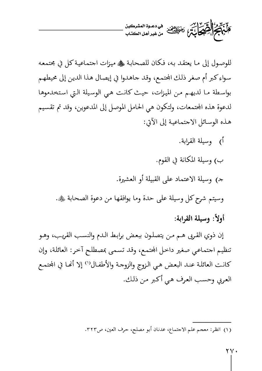 للوصول إلى ما يعتقد به، فكان للصحابة - رضي الله عنهم - ميزات اجتماعية كل في مجتمعه سواء كبر أم صغر ذلك المجتمع، وقد جاهدوا في إيصال هذا الدين إلى محيطهم بواسطة ما لديهم من الميزات، حيث كانت هي الوسيلة التي استخدموها لدعوة هذه المجتمعات، ولتكون هي الحامل الموصل إلى المدعوين، وقد تم تقسيم هذه الوسائل الاجتماعية إلى الآتي: