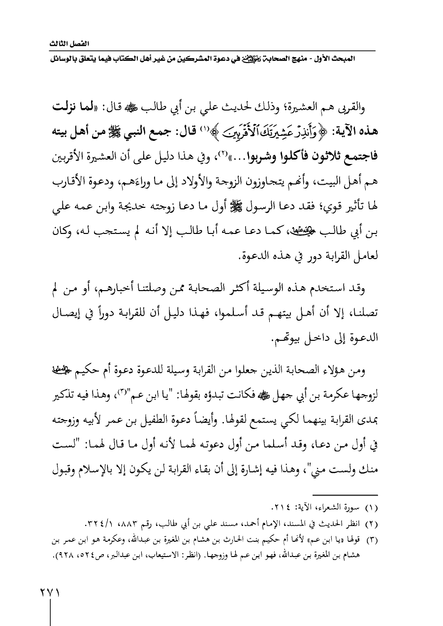 ومن هؤلاء الصحابة الذين جعلوا من القرابة وسيلة للدعوة دعوة أم حكيم - رضي الله عنها - لزوجها عكرمة بن أبي جهل - رضي الله عنه - فكانت تبدؤه بقولها: "يا ابن عم" (¬٣)، وهذا فيه تذكير بمدى القرابة بينهما لكي يستمع لقولها. وأيضاً دعوة الطفيل بن عمر لأبيه وزوجته في أول من دعا، وقد أسلما من أول دعوته لهما لأنه أول ما قال لهما: "لست منك ولست مني"، وهذا فيه إشارة إلى أن بقاء القرابة لن يكون إلا بالإسلام وقبول