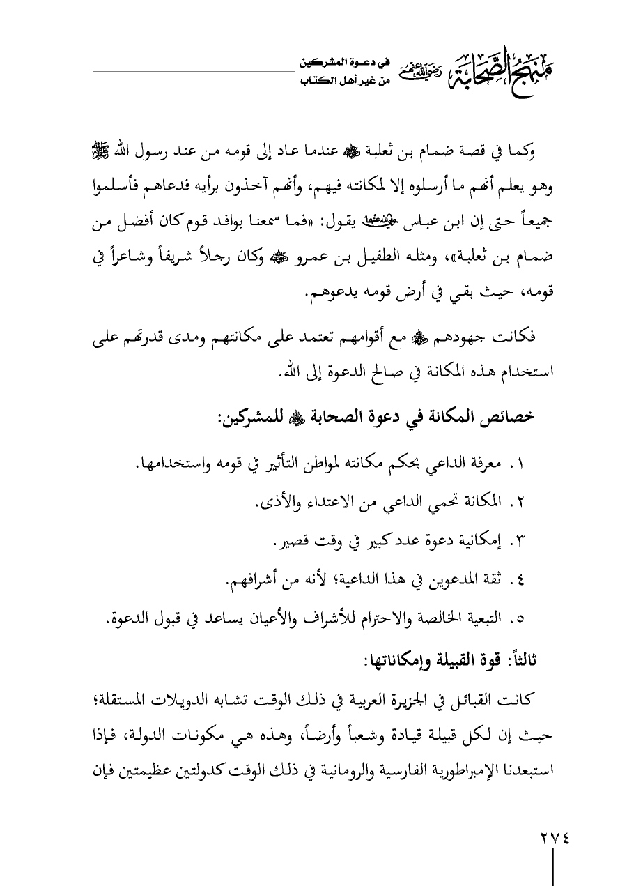وكما في قصة ضمام بن ثعلبة - رضي الله عنه - عندما عاد إلى قومه من عند رسول الله - صلى الله عليه وسلم - وهو يعلم أنهم ما أرسلوه إلا لمكانته فيهم، وأنهم آخذون برأيه فدعاهم فأسلموا جميعاً حتى إن ابن عباس - رضي الله عنهما - يقول: "فما سمعنا بوافد قوم كان أفضل من ضمام بن ثعلبة"، ومثله الطفيل بن عمرو - رضي الله عنه - وكان رجلاً شريفاً وشاعراً في قومه، حيث بقي في أرض قومه يدعوهم.