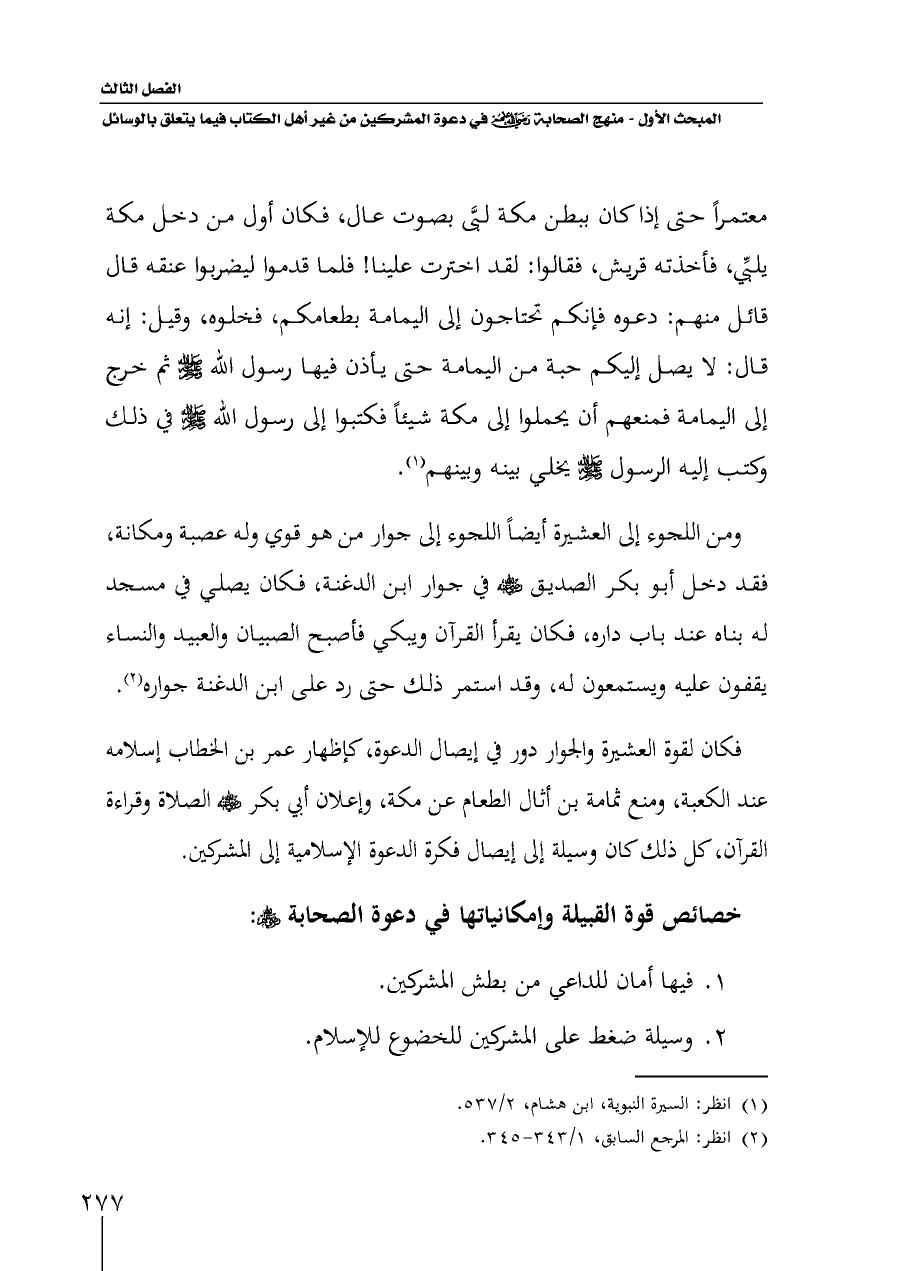 فكان لقوة العشيرة والجوار دور في إيصال الدعوة، كإظهار عمر بن الخطاب إسلامه عند الكعبة، ومنع ثمامة بن أثال الطعام عن مكة، وإعلان أبي بكر - رضي الله عنه - الصلاة وقراءة القرآن، كل ذلك كان وسيلة إلى إيصال فكرة الدعوة الإسلامية إلى المشركين.