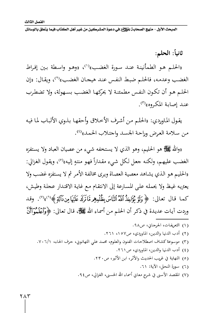 "والله - سبحانه وتعالى - هو الحليم، وهو الذي لا يستخفه شيء من عصيان العباد ولا يستفزه الغضب عليهم، ولكنه جعل لكل شيء مقداراً فهو منتهٍ إليه" (¬٥)، ويقول الغزالي: "الحليم هو الذي يشاهد معصية العصاة ويرى مخالفة الأمر ثم لا يستفزه غضب ولا يعتريه غيظ ولا يحمله على المسارعة إلى الانتقام مع غاية الاقتدار عجلة وطيش، كما قال تعالى: {وَلَوْ يُؤَاخِذُ اللَّهُ النَّاسَ بِظُلْمِهِمْ مَا تَرَكَ عَلَيْهَا مِنْ دَابَّةٍ} (¬٦) " (¬٧). وقد وردت آيات عديدة في ذكر أن الحلم من أسماء الله - سبحانه وتعالى -، قال تعالى: {وَاعْلَمُوا أَنَّ