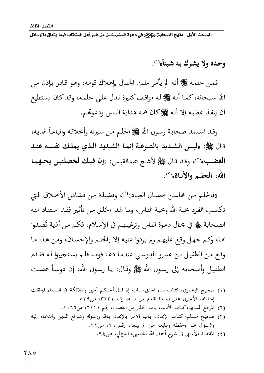 وقد استمد صحابة رسول الله - صلى الله عليه وسلم - الحلم من سيرته وأخلاقه واتباعاً لهديه، قال - صلى الله عليه وسلم -: "ليس الشديد بالصرعة إنما الشديد الذي يملك نفسه عند الغضب" (¬٢)، وقد قال - صلى الله عليه وسلم - لأشج عبدالقيس: "إن فيك لخصلتين يحبهما الله: الحلم والأناة" (¬٣).