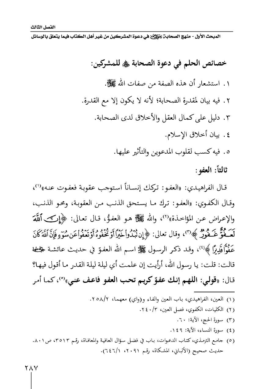 قال الفراهيدي: "العفو: تركك إنساناً استوجب عقوبة فعفوت عنه" (¬١)، وقال الكفوي: "العفو: ترك ما يستحق الذنب من العقوبة، ومحو الذنب، والإعراض عن المؤاخذة" (¬٢)، والله - سبحانه وتعالى - هو العفوُّ، قال تعالى: {إِنَّ اللَّهَ لَعَفُوٌّ غَفُورٌ} (¬٣)، وقال تعالى: {إِنْ تُبْدُوا خَيْرًا أَوْ تُخْفُوهُ أَوْ تَعْفُوا عَنْ سُوءٍ فَإِنَّ اللَّهَ كَانَ عَفُوًّا قَدِيرًا} (¬٤)، وقد ذكر الرسول - صلى الله عليه وسلم - اسم الله العفوّ في حديث عائشة - رضي الله عنها - قالت: قلت: يا رسول الله، أرأيت إن علمت أي ليلة ليلة القدر ما أقول فيها؟ قال: "قولي: اللهم إنك عفوّ كريم تحب العفو فاعف عني" (¬٥)، كما أمر