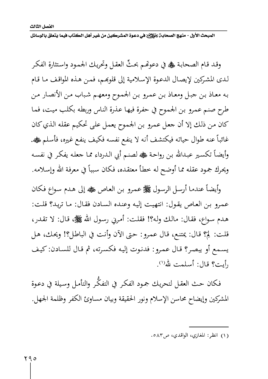 وقد قام الصحابة - رضي الله عنهم - في دعوتهم بحثِّ العقل وتحريك الجمود واستثارة الفكر لدى المشركين لإيصال الدعوة الإسلامية إلى قلوبهم، فمن هذه المواقف ما قام به معاذ بن جبل ومعاذ بن عمرو بن الجموح ومعهم شباب من الأنصار من طرح صنم عمرو بن الجموح في حفرة فيها عذرة الناس وربطه بكلب ميت، فما كان من ذلك إلا أن جعل عمرو بن الجموح يعمل على تحكيم عقله الذي كان غائباً عنه طوال حياته فيكتشف أنه لا ينفع نفسه فكيف ينفع غيره، فأسلم - رضي الله عنه -. وأيضاً تكسير عبدالله بن رواحة - رضي الله عنه - لصنم أبي الدرداء مما جعله يفكر في نفسه ويحرك جمود عقله مما أوضح له خطأ معتقده، فكان سبباً في معرفة الله وإسلامه.