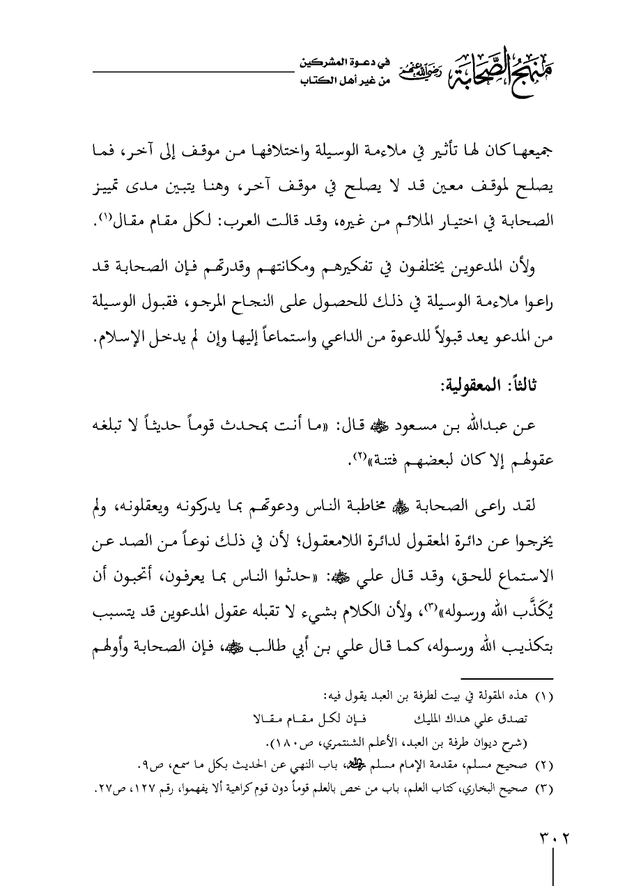 لقد راعى الصحابة - رضي الله عنهم - مخاطبة الناس ودعوتهم بما يدركونه ويعقلونه، ولم يخرجوا عن دائرة المعقول لدائرة اللامعقول؛ لأن في ذلك نوعاً من الصد عن الاستماع للحق، وقد قال علي - رضي الله عنه -: "حدثوا الناس بما يعرفون، أتحبون أن يُكَذَّب الله ورسوله" (¬٣)، ولأن الكلام بشيء لا تقبله عقول المدعوين قد يتسبب بتكذيب الله ورسوله، كما قال علي بن أبي طالب - رضي الله عنه -، فإن الصحابة وأولهم