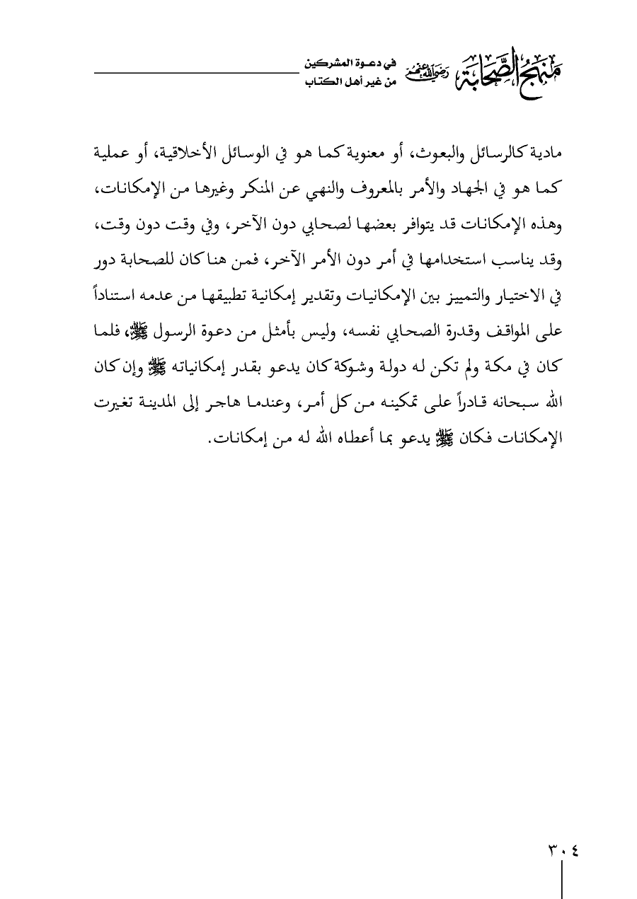 مادية كالرسائل والبعوث، أو معنوية كما هو في الوسائل الأخلاقية، أو عملية كما هو في الجهاد والأمر بالمعروف والنهي عن المنكر وغيرها من الإمكانات، وهذه الإمكانات قد يتوافر بعضها لصحابي دون الآخر، وفي وقت دون وقت، وقد يناسب استخدامها في أمر دون الأمر الآخر، فمن هنا كان للصحابة دور في الاختيار والتمييز بين الإمكانيات وتقدير إمكانية تطبيقها من عدمه استناداً على المواقف وقدرة الصحابي نفسه، وليس بأمثل من دعوة الرسول - صلى الله عليه وسلم -، فلما كان في مكة ولم تكن له دولة وشوكة كان يدعو بقدر إمكانياته - صلى الله عليه وسلم - وإن كان الله سبحانه قادراً على تمكينه من كل أمر، وعندما هاجر إلى المدينة تغيرت الإمكانات فكان - صلى الله عليه وسلم - يدعو بما أعطاه الله له من إمكانات.
