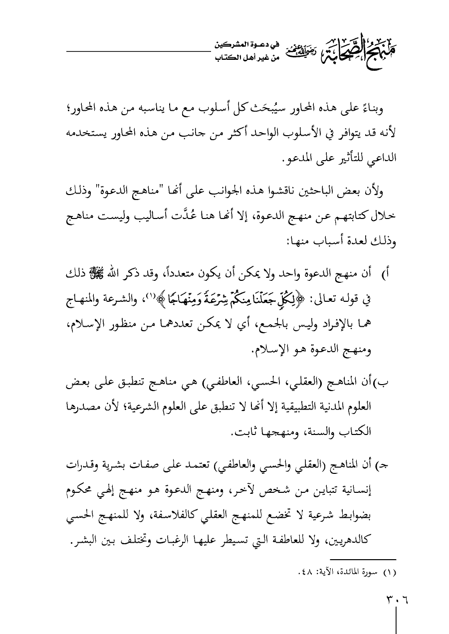 جـ) أن المناهج (العقلي والحسي والعاطفي) تعتمد على صفات بشرية وقدرات إنسانية تتباين من شخص لآخر، ومنهج الدعوة هو منهج إلهي محكوم بضوابط شرعية لا تخضع للمنهج العقلي كالفلاسفة، ولا للمنهج الحسي كالدهريين، ولا للعاطفة التي تسيطر عليها الرغبات وتختلف بين البشر.