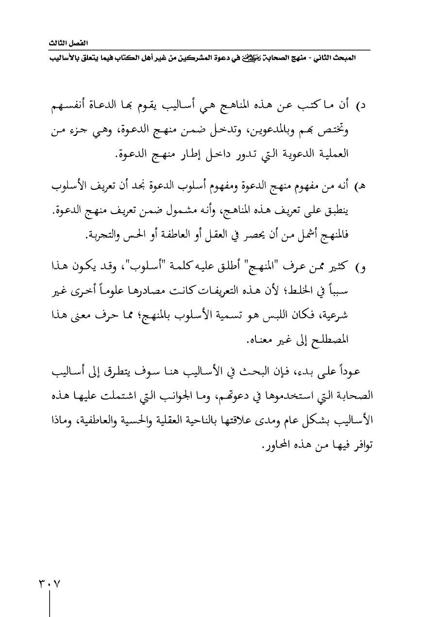 د) أن ما كتب عن هذه المناهج هي أساليب يقوم بها الدعاة أنفسهم وتختص بهم وبالمدعوين، وتدخل ضمن منهج الدعوة، وهي جزء من العملية الدعوية التي تدور داخل إطار منهج الدعوة.