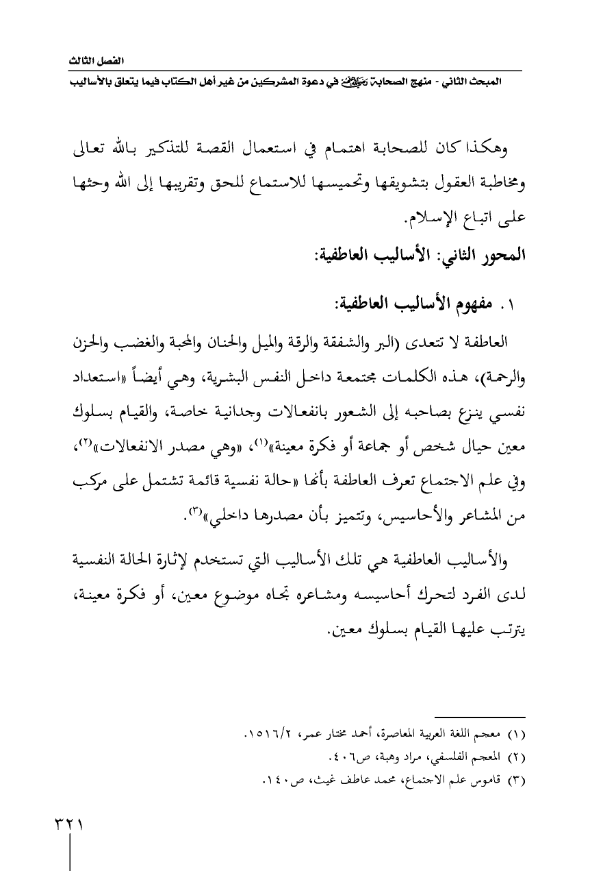 العاطفة لا تتعدى (البر والشفقة والرقة والميل والحنان والمحبة والغضب والحزن والرحمة)، هذه الكلمات مجتمعة داخل النفس البشرية، وهي أيضاً "استعداد نفسي ينزع بصاحبه إلى الشعور بانفعالات وجدانية خاصة، والقيام بسلوك معين حيال شخص أو جماعة أو فكرة معينة" (¬١)، "وهي مصدر الانفعالات" (¬٢)، وفي علم الاجتماع تعرف العاطفة بأنها "حالة نفسية قائمة تشتمل على مركب من المشاعر والأحاسيس، وتتميز بأن مصدرها داخلي" (¬٣).
