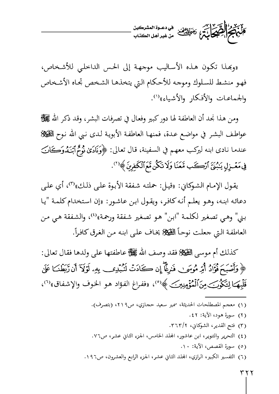 ومن هذا نجد أن العاطفة لها دور كبير وفعال في تصرفات البشر، وقد ذكر الله - سبحانه وتعالى - عواطف البشر في مواضع عدة، فمنها العاطفة الأبوية لدى نبي الله نوح - عليه السلام - عندما نادى ابنه ليركب معهم في السفينة، قال تعالى: {وَنَادَى نُوحٌ ابْنَهُ وَكَانَ فِي مَعْزِلٍ يَابُنَيَّ ارْكَبْ مَعَنَا وَلَا تَكُنْ مَعَ الْكَافِرِينَ} (¬٢).