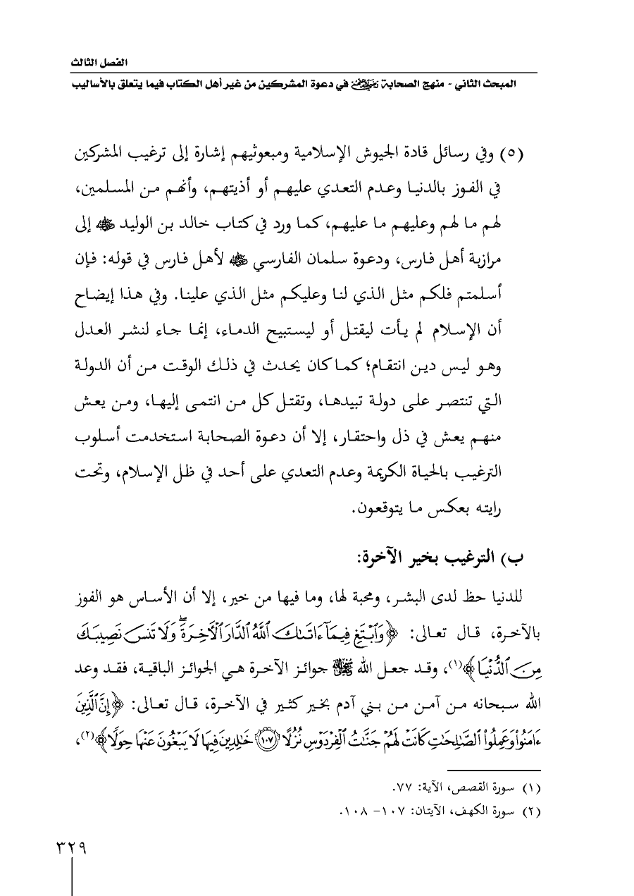 (٥) وفي رسائل قادة الجيوش الإسلامية ومبعوثيهم إشارة إلى ترغيب المشركين في الفوز بالدنيا وعدم التعدي عليهم أو أذيتهم، وأنهم من المسلمين، لهم ما لهم وعليهم ما عليهم، كما ورد في كتاب خالد بن الوليد - رضي الله عنه - إلى مرازبة أهل فارس، ودعوة سلمان الفارسي - رضي الله عنه - لأهل فارس في قوله: فإن أسلمتم فلكم مثل الذي لنا وعليكم مثل الذي علينا. وفي هذا إيضاح أن الإسلام لم يأت ليقتل أو ليستبيح الدماء، إنما جاء لنشر العدل وهو ليس دين انتقام؛ كما كان يحدث في ذلك الوقت من أن الدولة التي تنتصر على دولة تبيدها، وتقتل كل من انتمى إليها، ومن يعش منهم يعش في ذل واحتقار، إلا أن دعوة الصحابة استخدمت أسلوب الترغيب بالحياة الكريمة وعدم التعدي على أحد في ظل الإسلام، وتحت رايته بعكس ما يتوقعون.