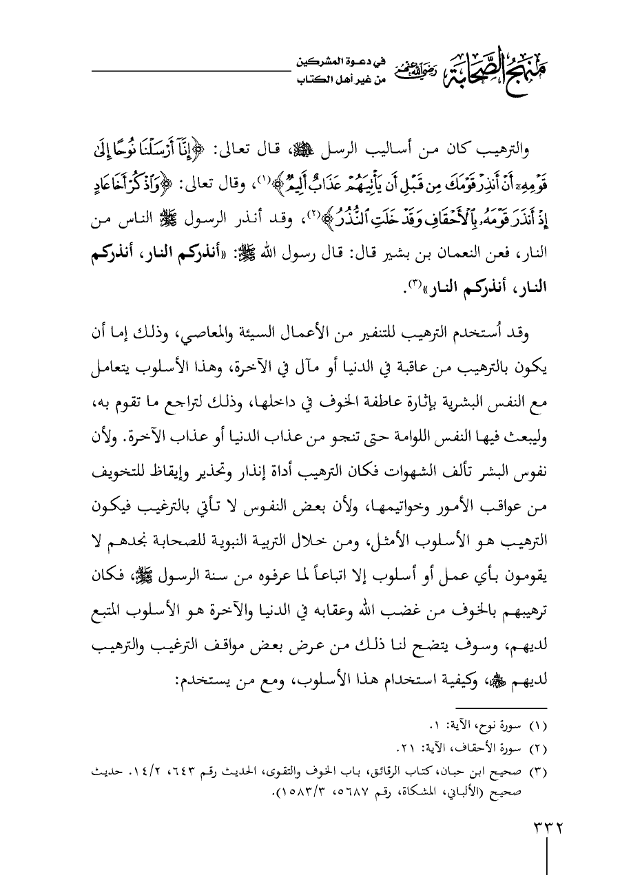 والترهيب كان من أساليب الرسل - عليهم السلام -، قال تعالى: {إِنَّا أَرْسَلْنَا نُوحًا إِلَى قَوْمِهِ أَنْ أَنْذِرْ قَوْمَكَ مِنْ قَبْلِ أَنْ يَأْتِيَهُمْ عَذَابٌ أَلِيمٌ} (¬١)، وقال تعالى: {وَاذْكُرْ أَخَا عَادٍ إِذْ أَنْذَرَ قَوْمَهُ بِالْأَحْقَافِ وَقَدْ خَلَتِ النُّذُرُ} (¬٢)، وقد أنذر الرسول - صلى الله عليه وسلم - الناس من النار، فعن النعمان بن بشير قال: قال رسول الله - صلى الله عليه وسلم -: "أنذركم النار، أنذركم النار، أنذركم النار" (¬٣).