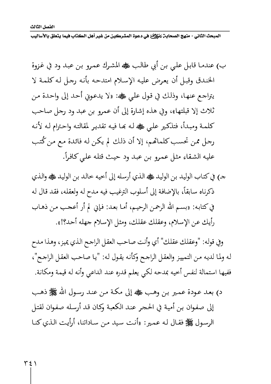 جـ) في كتاب الوليد بن الوليد - رضي الله عنه - الذي أرسله إلى أخيه خالد بن الوليد - رضي الله عنه - والذي ذكرناه سابقاً، بالإضافة إلى أسلوب الترغيب فيه مدح له ولعقله، فقد قال له في كتابه: "بسم الله الرحمن الرحيم، أما بعد: فإني لم أر أعجب من ذهاب رأيك عن الإسلام، وعقلك عقلك، ومثل الإسلام جهله أحد؟! ".