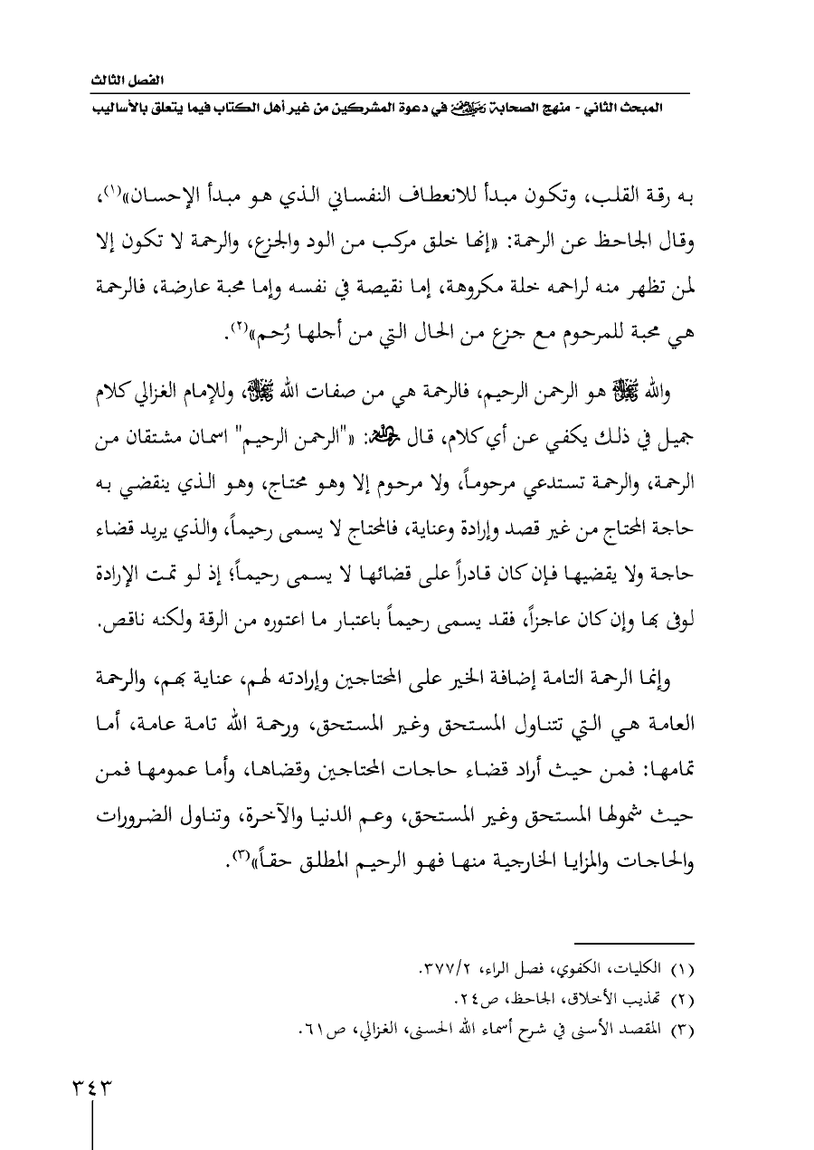 به رقة القلب، وتكون مبدأ للانعطاف النفساني الذي هو مبدأ الإحسان" (¬١)، وقال الجاحظ عن الرحمة: "إنها خلق مركب من الود والجزع، والرحمة لا تكون إلا لمن تظهر منه لراحمه خلة مكروهة، إما نقيصة في نفسه وإما محبة عارضة، فالرحمة هي محبة للمرحوم مع جزع من الحال التي من أجلها رُحم" (¬٢).