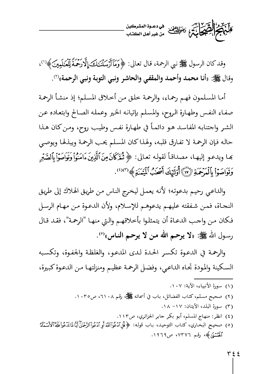 أما المسلمون فهم رحماء، والرحمة خلق من أخلاق المسلم؛ إذ منشأ الرحمة صفاء النفس وطهارة الروح، والمسلم بإتيانه الخير وعمله الصالح وابتعاده عن الشر واجتنابه المفاسد هو دائماً في طهارة نفس وطيب روح، ومن كان هذا حاله فإن الرحمة لا تفارق قلبه، ولهذا كان المسلم يحب الرحمة ويبذلها ويوصي بها ويدعو إليها، مصداقاً لقوله تعالى: {ثُمَّ كَانَ مِنَ الَّذِينَ آمَنُوا وَتَوَاصَوْا بِالصَّبْرِ وَتَوَاصَوْا بِالْمَرْحَمَةِ (١٧) أُولَئِكَ أَصْحَابُ الْمَيْمَنَةِ} (¬٣) (¬٤).