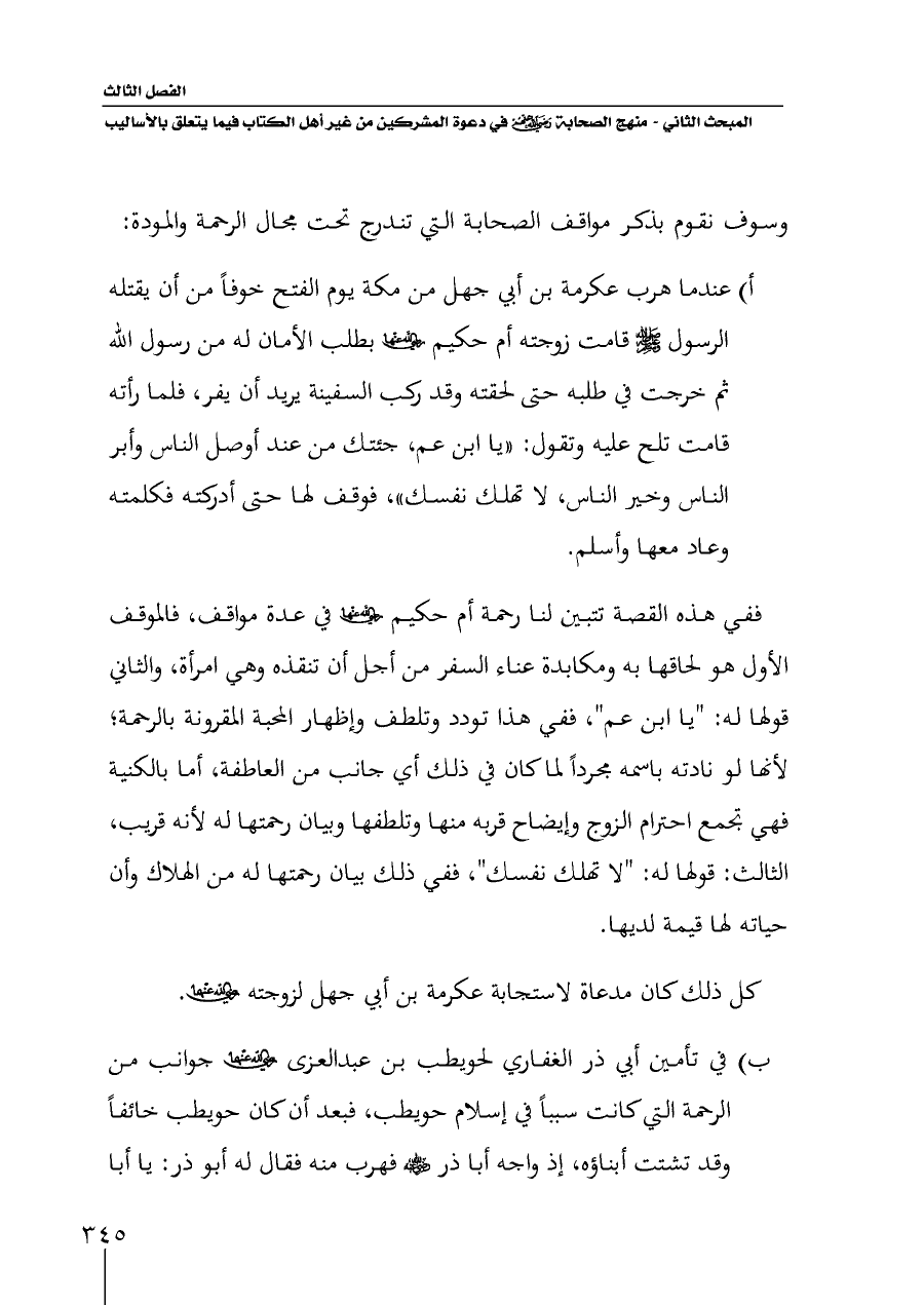ب) في تأمين أبي ذر الغفاري لحويطب بن عبدالعزى - رضي الله عنهما - جوانب من الرحمة التي كانت سبباً في إسلام حويطب، فبعد أن كان حويطب خائفاً وقد تشتت أبناؤه، إذ واجه أبا ذر - رضي الله عنه - فهرب منه فقال له أبو ذر: يا أبا
