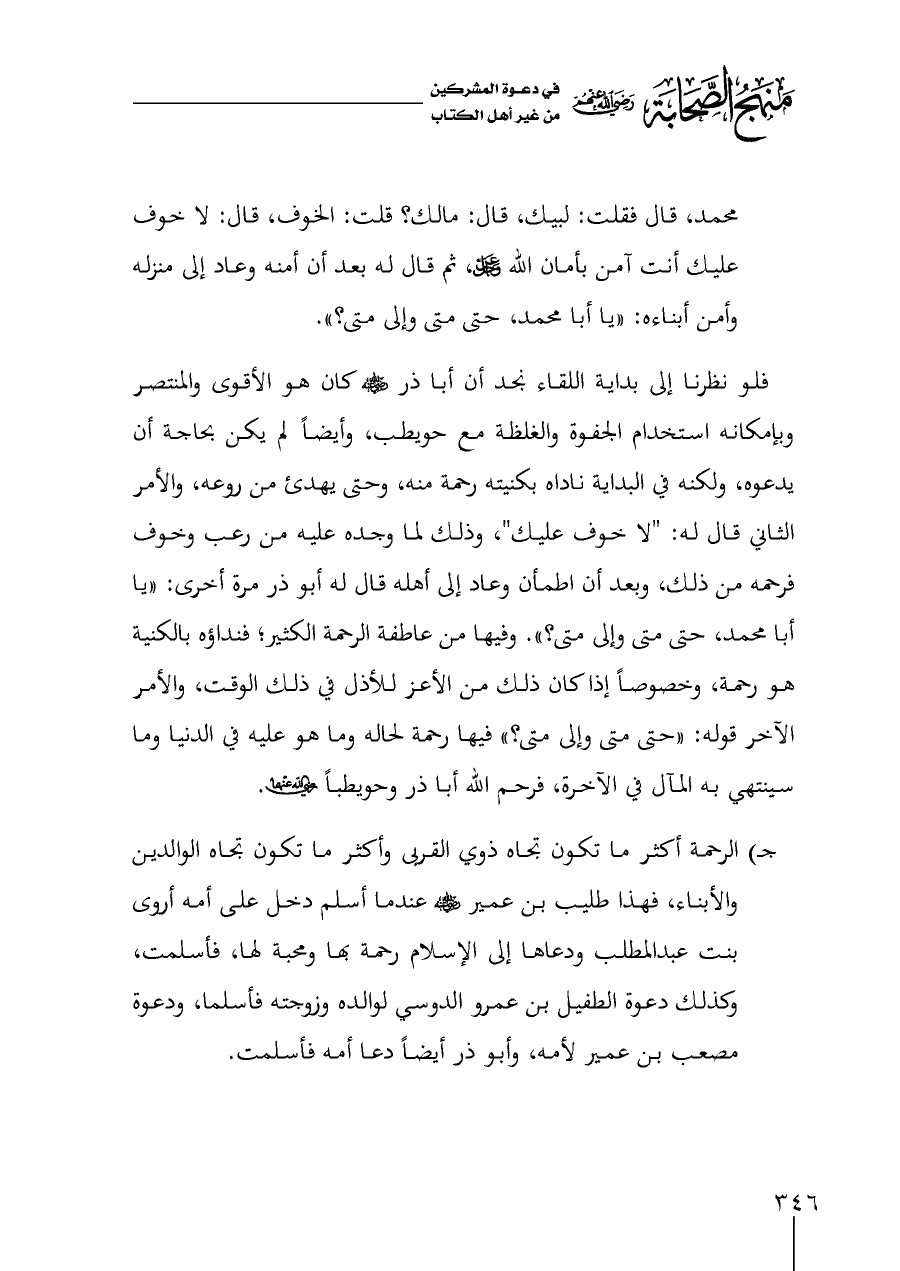 فلو نظرنا إلى بداية اللقاء نجد أن أبا ذر - رضي الله عنه - كان هو الأقوى والمنتصر وبإمكانه استخدام الجفوة والغلظة مع حويطب، وأيضاً لم يكن بحاجة أن يدعوه، ولكنه في البداية ناداه بكنيته رحمة منه، وحتى يهدئ من روعه، والأمر الثاني قال له: "لا خوف عليك"، وذلك لما وجده عليه من رعب وخوف فرحمه من ذلك، وبعد أن اطمأن وعاد إلى أهله قال له أبو ذر مرة أخرى: (يا أبا محمد، حتى متى وإلى متى؟ (. وفيها من عاطفة الرحمة الكثير؛ فنداؤه بالكنية هو رحمة، وخصوصاً إذا كان ذلك من الأعز للأذل في ذلك الوقت، والأمر الآخر قوله: (حتى متى وإلى متى؟ (فيها رحمة لحاله وما هو عليه في الدنيا وما سينتهي به المآل في الآخرة، فرحم الله أبا ذر وحويطباً - رضي الله عنهما -.