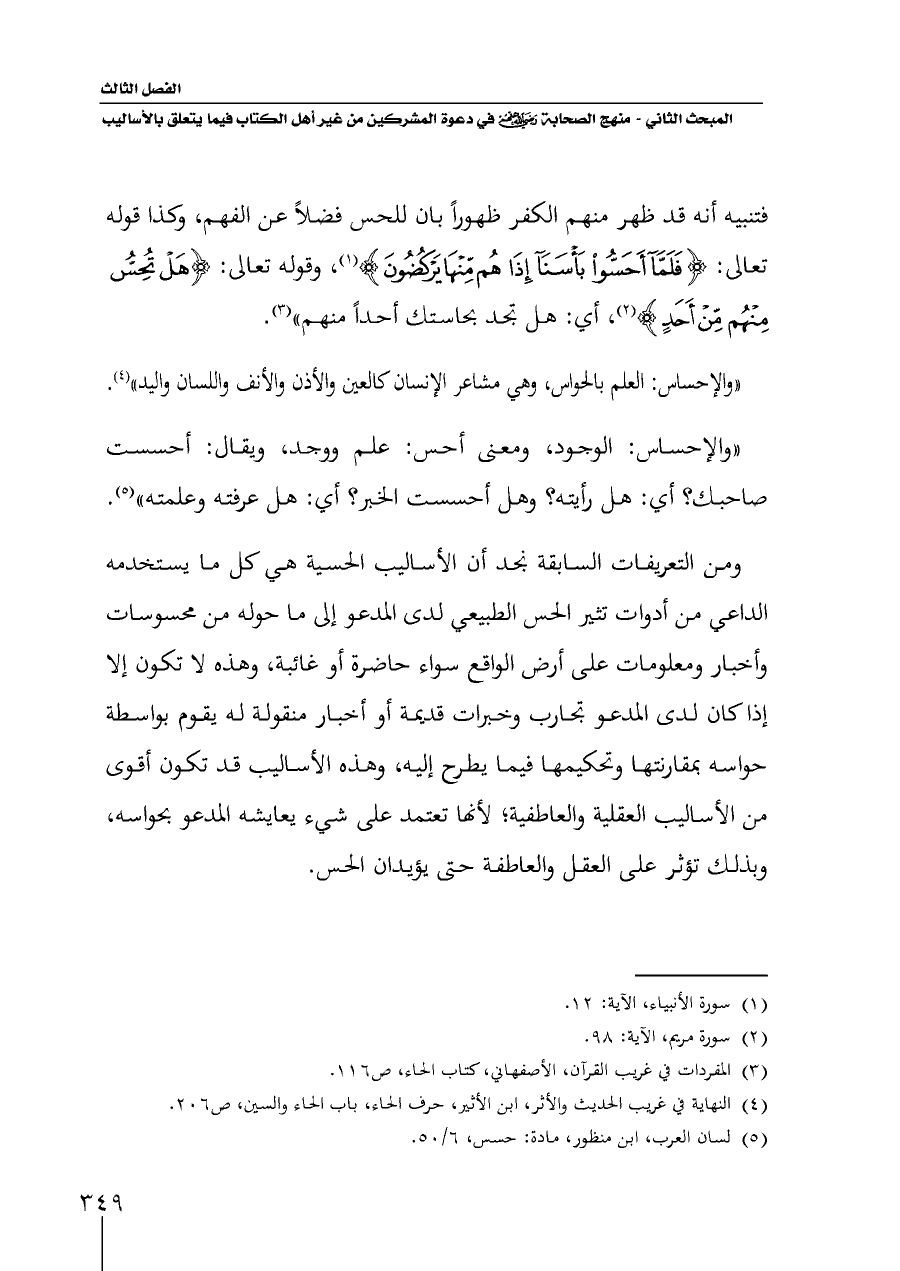 فتنبيه أنه قد ظهر منهم الكفر ظهوراً بان للحس فضلاً عن الفهم، وكذا قوله تعالى: {فَلَمَّا أَحَسُّوا بَأْسَنَا إِذَا هُمْ مِنْهَا يَرْكُضُونَ} (¬١)، وقوله تعالى: {هَلْ تُحِسُّ مِنْهُمْ مِنْ أَحَدٍ} (¬٢)، أي: هل تجد بحاستك أحداً منهم" (¬٣).