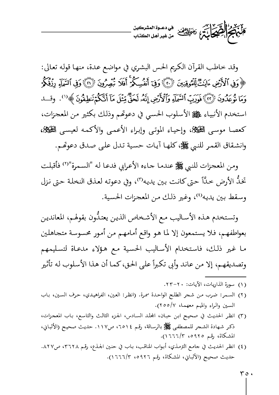 وقد خاطب القرآن الكريم الحس البشري في مواضع عدة، منها قوله تعالى: {وَفِي الْأَرْضِ آيَاتٌ لِلْمُوقِنِينَ (٢٠) وَفِي أَنْفُسِكُمْ أَفَلَا تُبْصِرُونَ (٢١) وَفِي السَّمَاءِ رِزْقُكُمْ وَمَا تُوعَدُونَ (٢٢) فَوَرَبِّ السَّمَاءِ وَالْأَرْضِ إِنَّهُ لَحَقٌّ مِثْلَ مَا أَنَّكُمْ تَنْطِقُونَ} (¬١). وقد استخدم الأنبياء - عليهم السلام - الأسلوب الحسي في دعوتهم وذلك بكثير من المعجزات، كعصا موسى - عليه السلام -، وإحياء الموتى وإبراء الأعمى والأكمه لعيسى - عليه السلام -، وانشقاق القمر للنبي - صلى الله عليه وسلم -، كلها آيات حسية تدل على صدق دعوتهم.